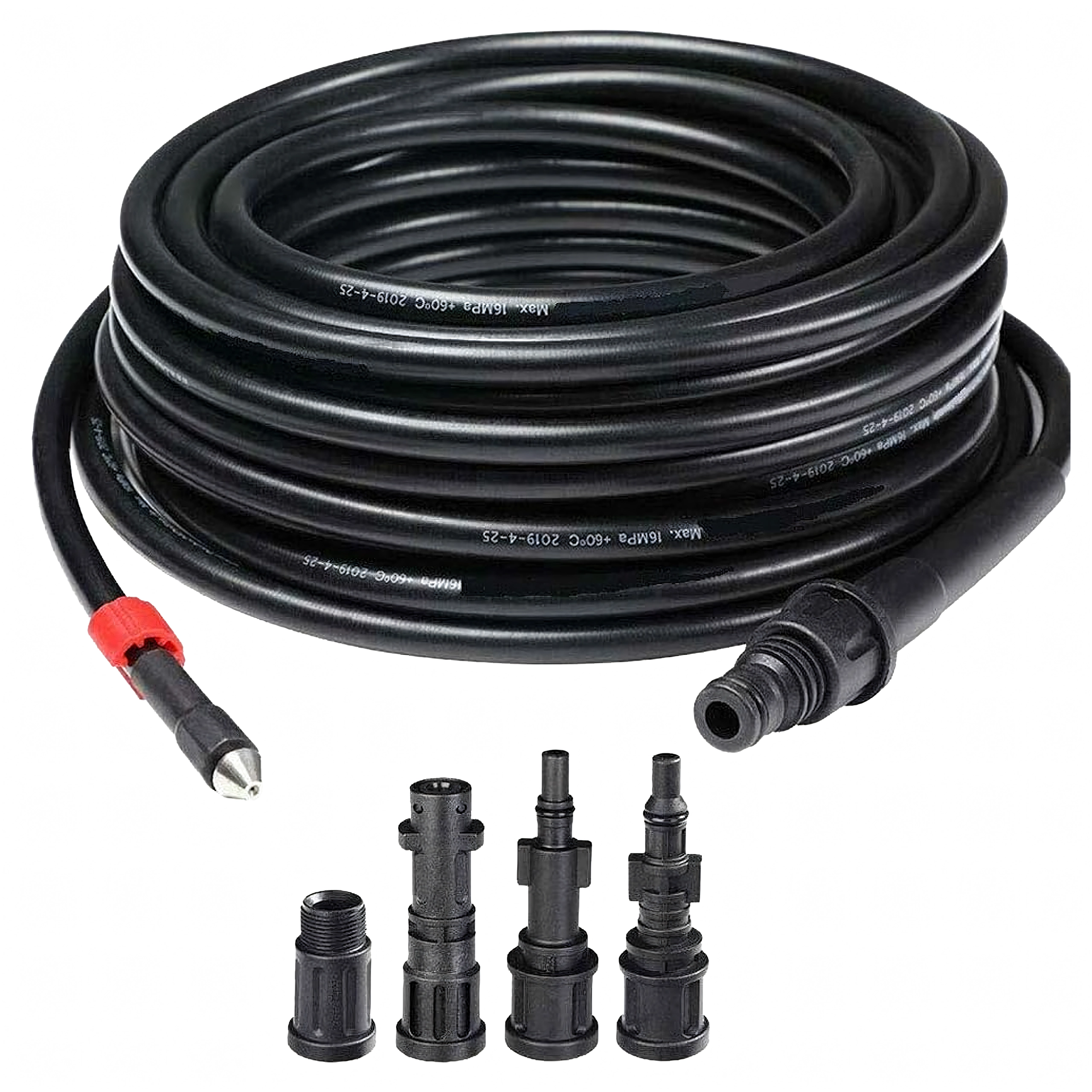 En kraftig renseslange på 20 m til højtryksrensere fjerner hurtigt tilstopninger i afløb, vandlåse og kloakrør. Takket være de universelle adaptere, den slanke dyse og den fleksible slange passerer den let gennem bøjninger og renser rør for fedt, hår og aflejringer.