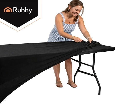 Praktisk og elegant elastisk betræk til banketbord fra RUHHY i sort, som forvandler ethvert bord på et øjeblik. Sidder perfekt uden at krølle, glider ikke og kræver ingen strygning. Ideelt til catering, bryllupper, fester og firmaarrangementer – skaber et glat, professionelt look og beskytter samtidig bordplade og ben.