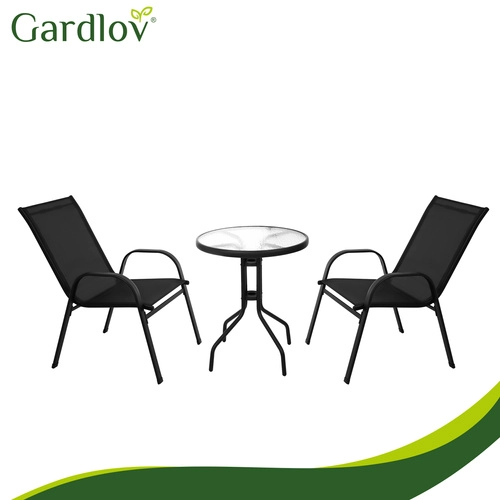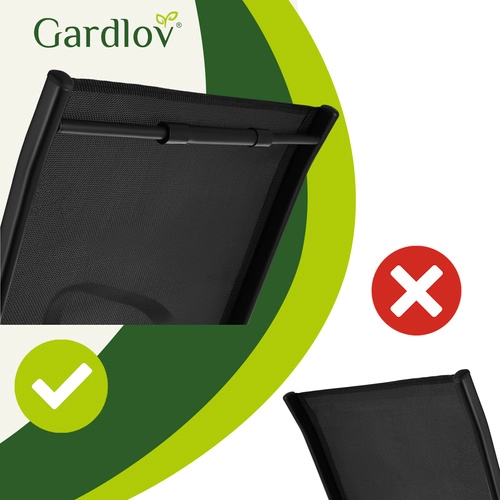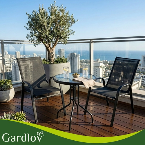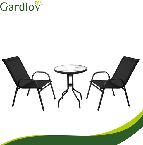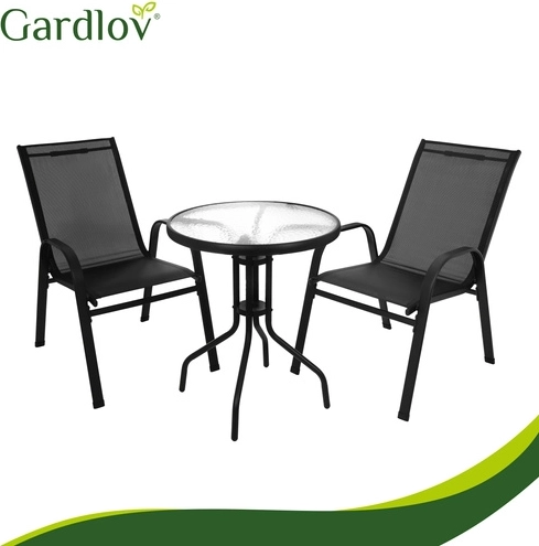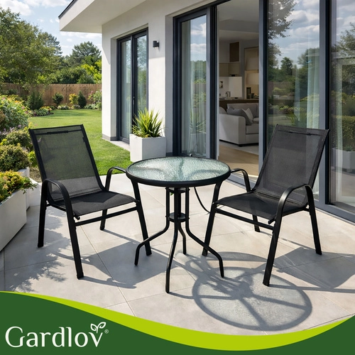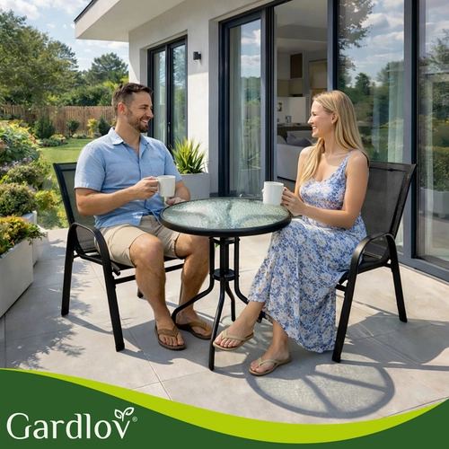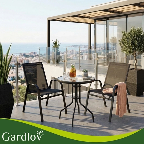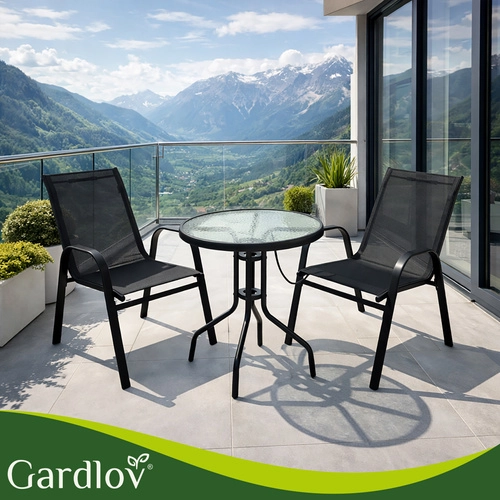 Det elegante altansæt GARDLOV kombinerer moderne look og lang levetid. Den pulverlakerede jernramme giver stabilitet og korrosionsbeskyttelse, mens de åndbare sæder behageligt tilpasser sig kroppen. Den teksturerede bordplade i 5 mm hærdet glas giver både sikkerhed og stil.