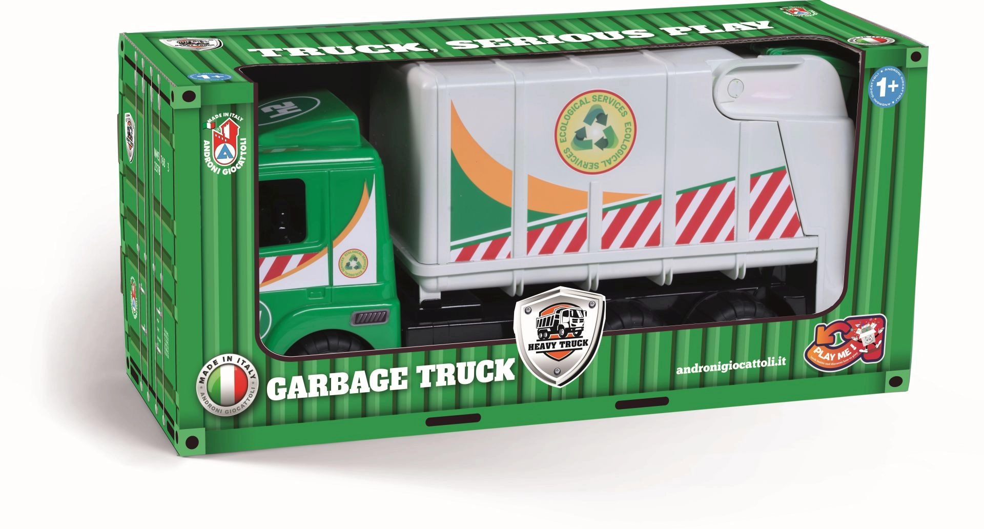Bilen er en del af Heavy Trucks-serien og udmærker sig ved en holdbar konstruktion af kvalitetsplast fremstillet i Italien. Den er sikker og tilpasset de mindste børn fra 12 måneder og understøtter finmotorik, hånd–øje-koordination og rolleleger med fokus på oprydning og genbrug.