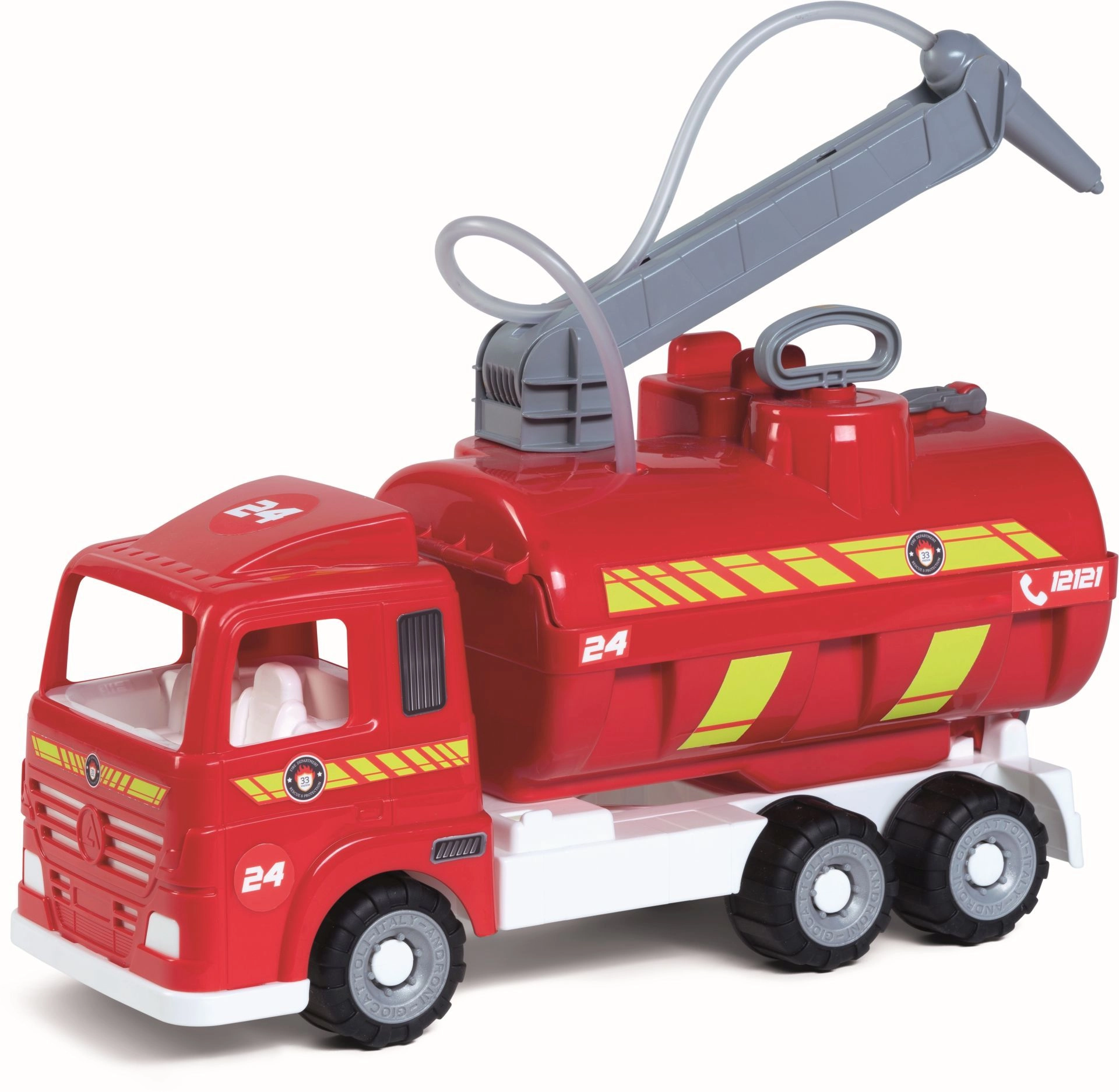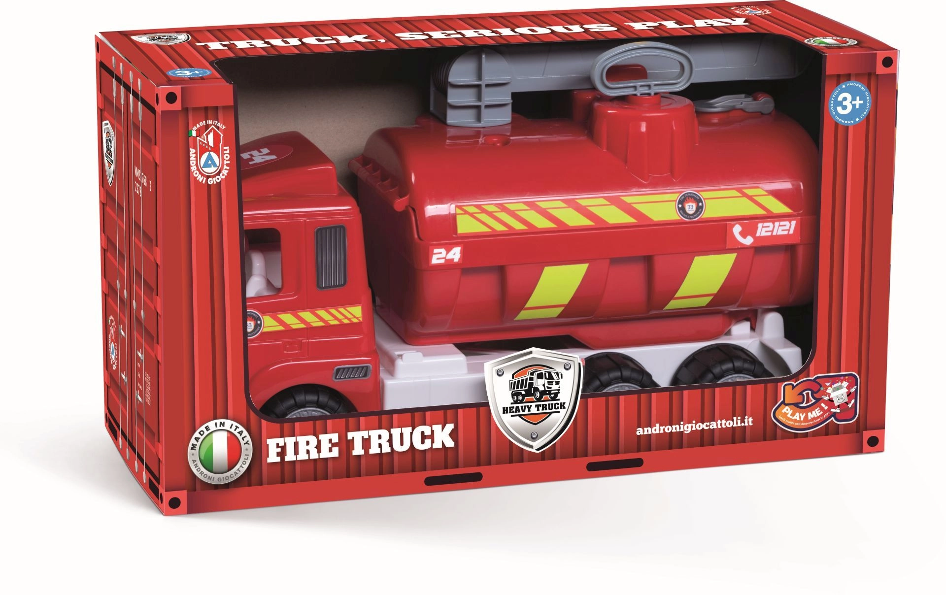 ANDRONI Heavy Trucks-brandbilen giver børn en autentisk legeoplevelse. Med vandtank og håndpumpe kan de virkelig sprøjte med vand og “slukke” brande i haven eller derhjemme. De gummibelagte hjul giver fremragende vejgreb og mere støjsvag kørsel, mens den solide konstruktion i kvalitetsplast tåler selv intens børneleg.