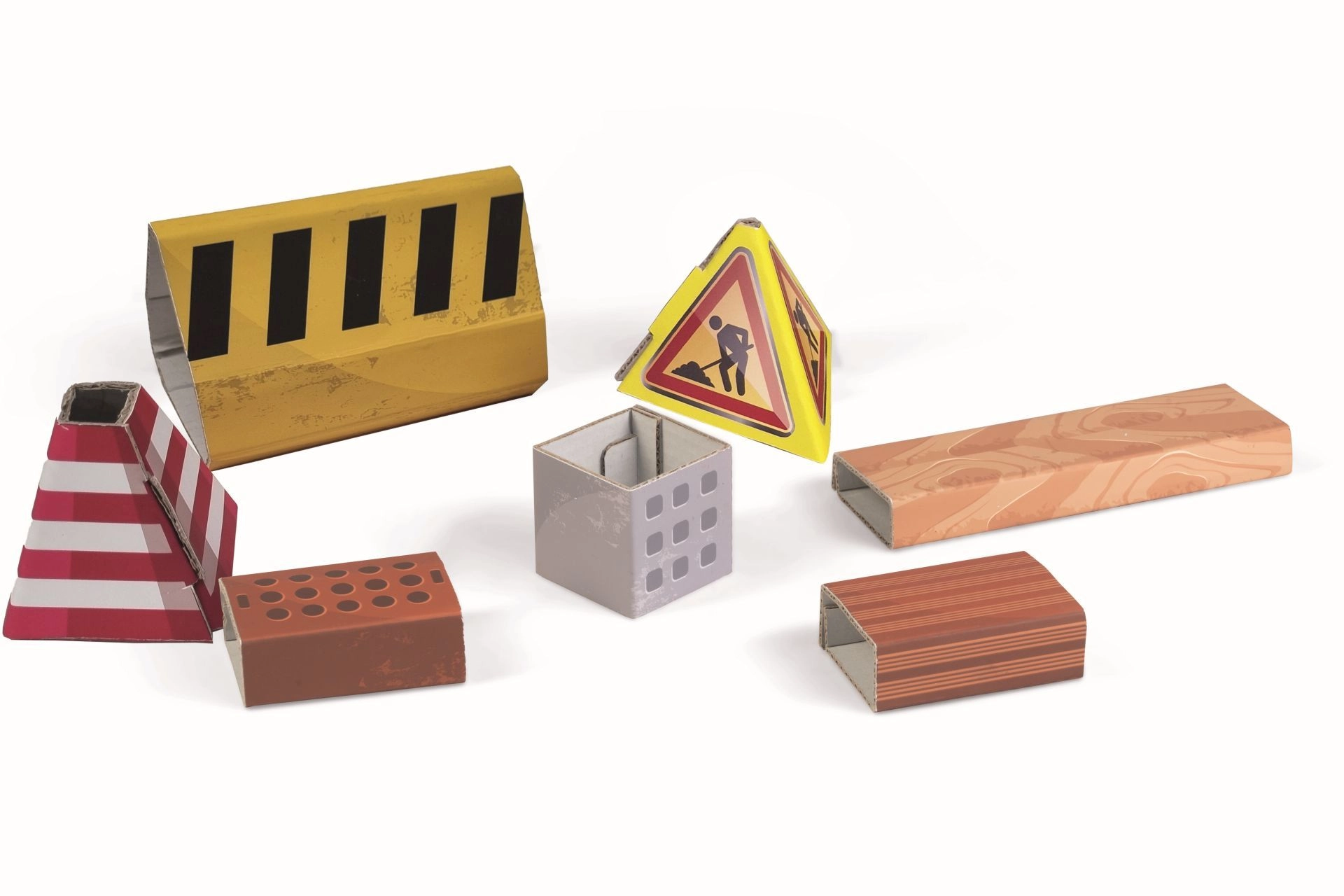 Sættet med kartonblokke og skiltning udvider legemulighederne – byggeri, forhindringer og trafiksituationer for endnu mere sjov.