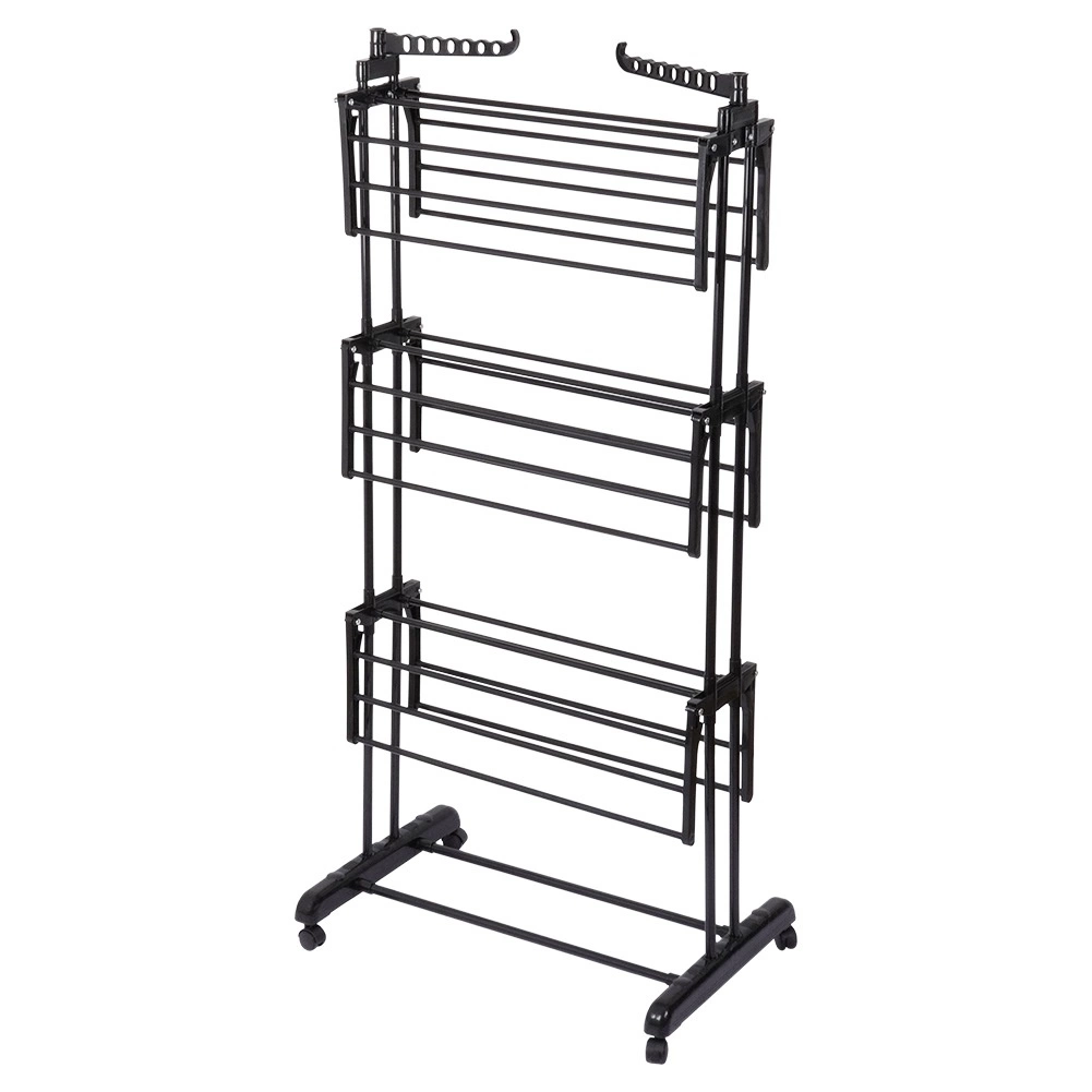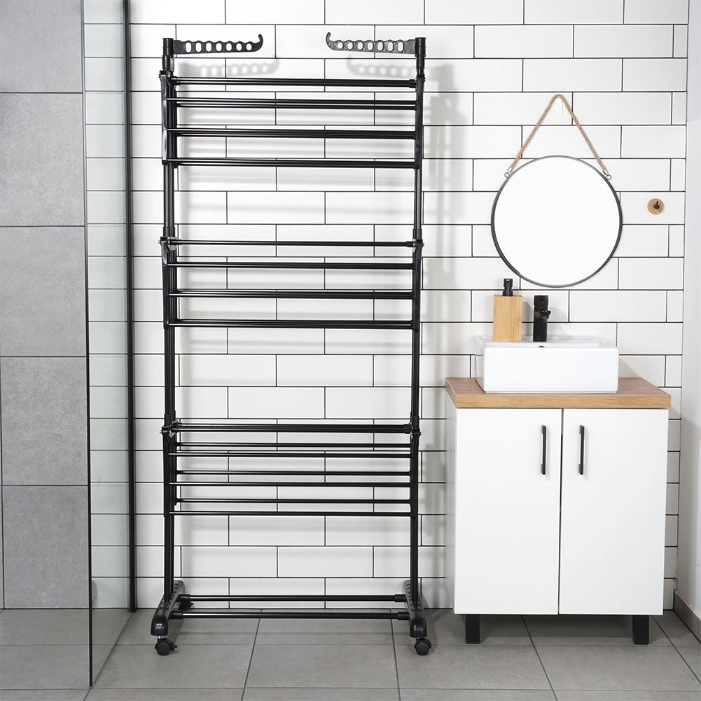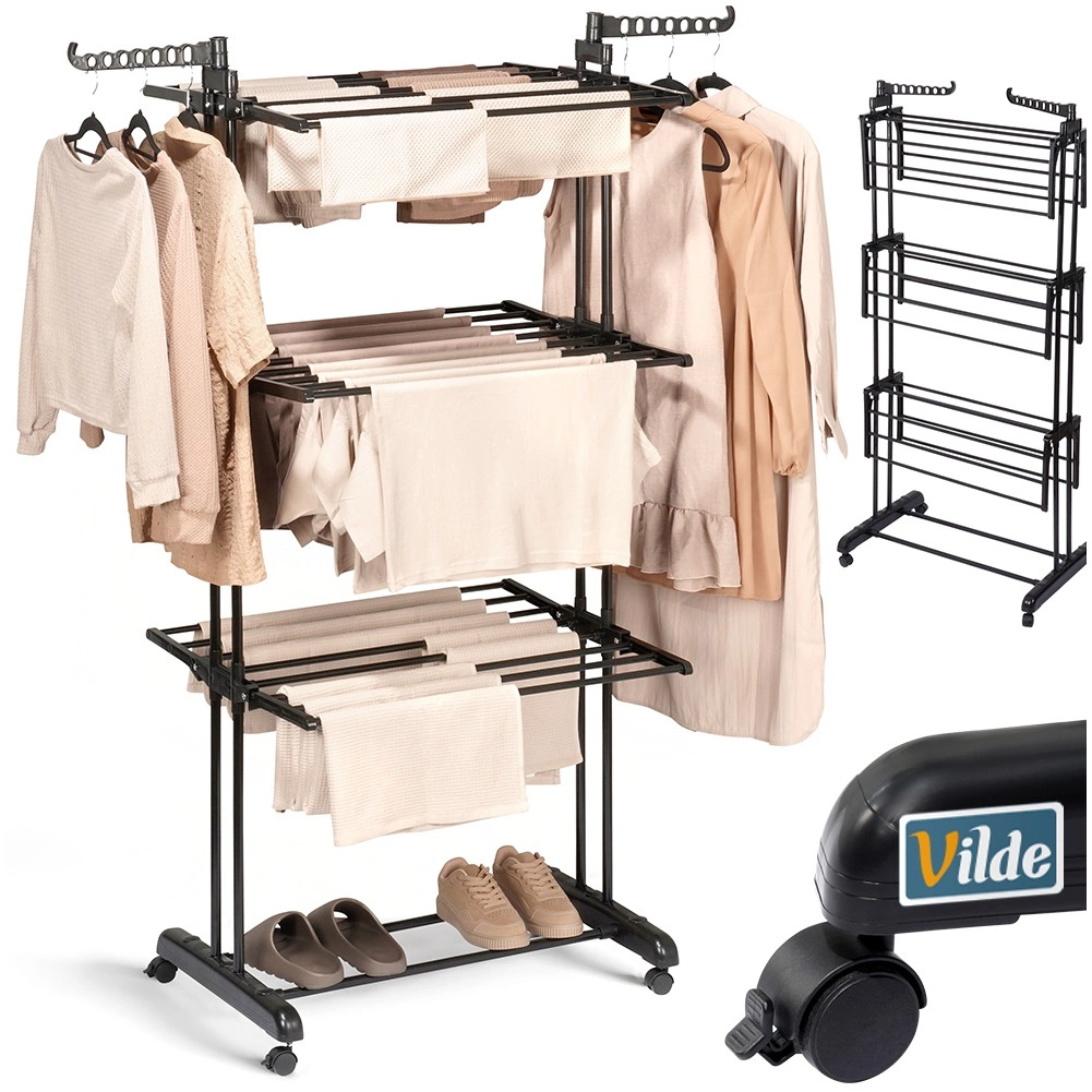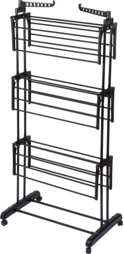 Praktisk treetagers tørrestativ til tøj med robust metalkonstruktion i sort farve tilbyder op til 24 m tørreflade, bæreevne 25 kg og praktiske hjul med bremse. Takket være det lodrette design sparer det plads, har sammenklappelige vinger, side arme til bøjler (14 pladser) og nederste hylde til fodtøj – ideelt til lejlighed, altan og terrasse.