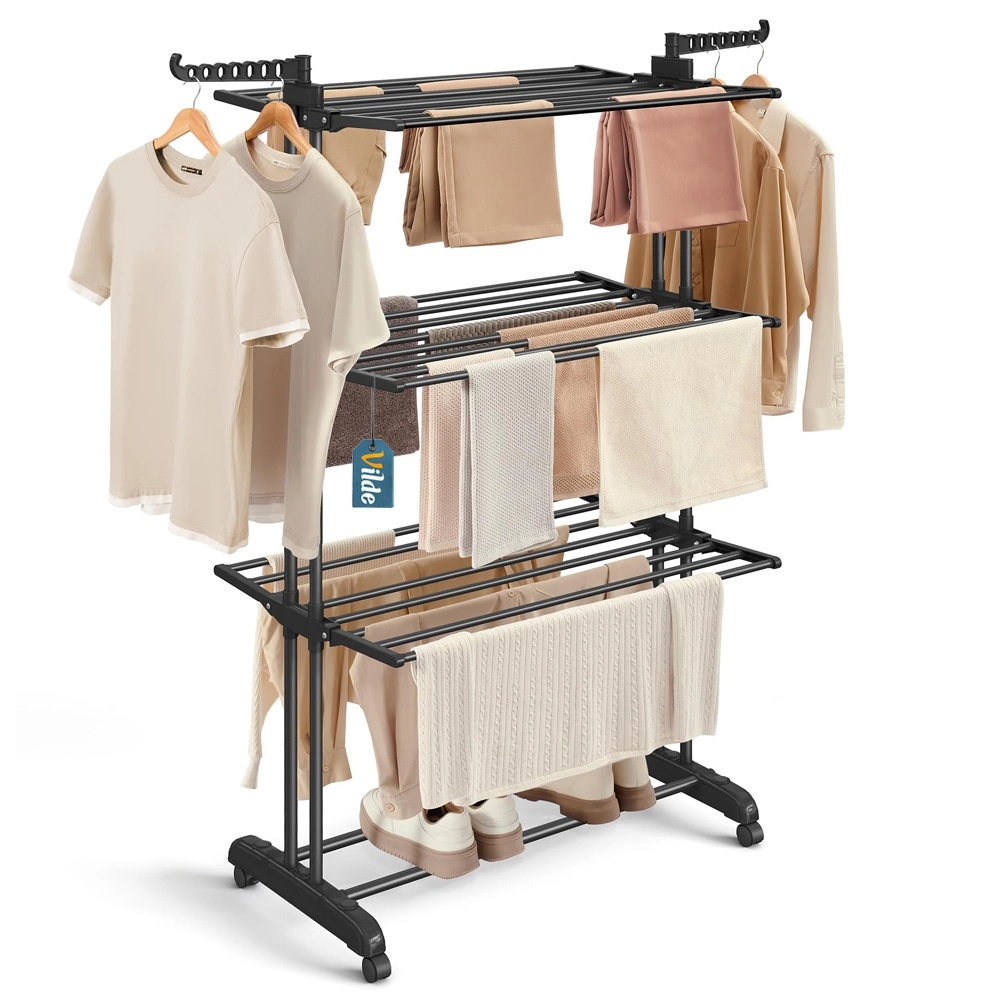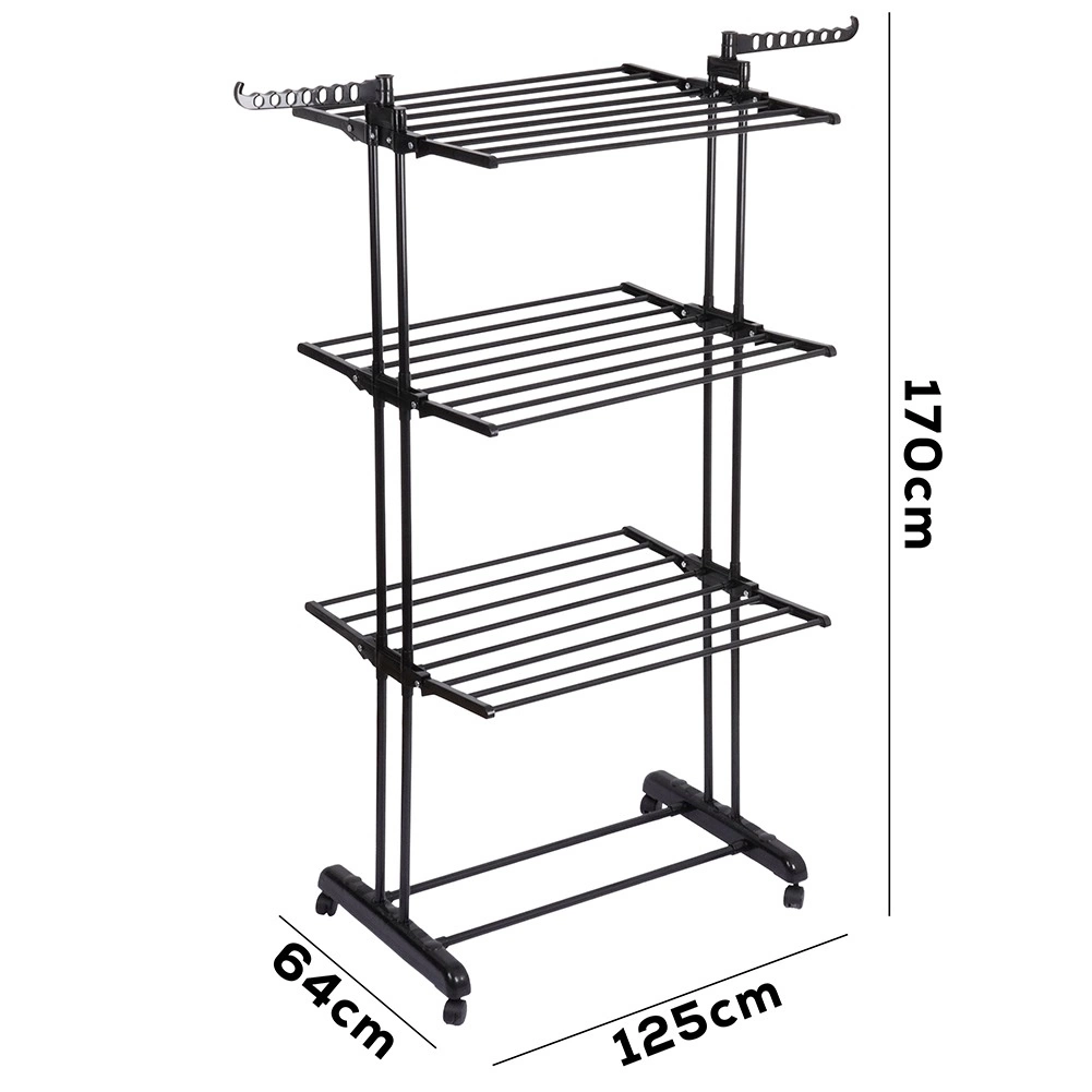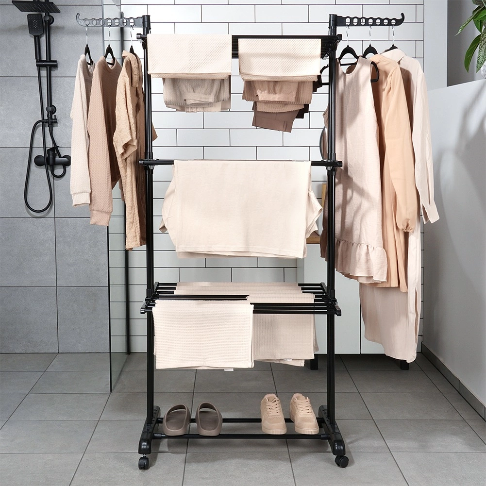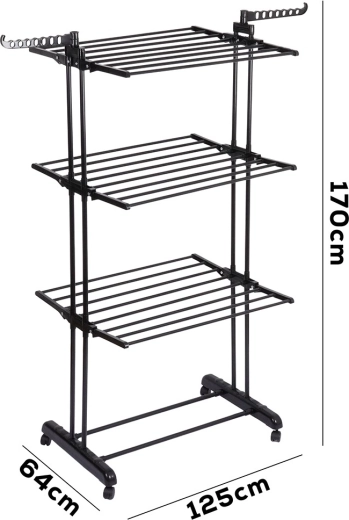 Praktisk treetagers tørrestativ til tøj med robust metalkonstruktion i sort farve tilbyder op til 24 m tørreflade, bæreevne 25 kg og praktiske hjul med bremse. Takket være det lodrette design sparer det plads, har sammenklappelige vinger, side arme til bøjler (14 pladser) og nederste hylde til fodtøj – ideelt til lejlighed, altan og terrasse.