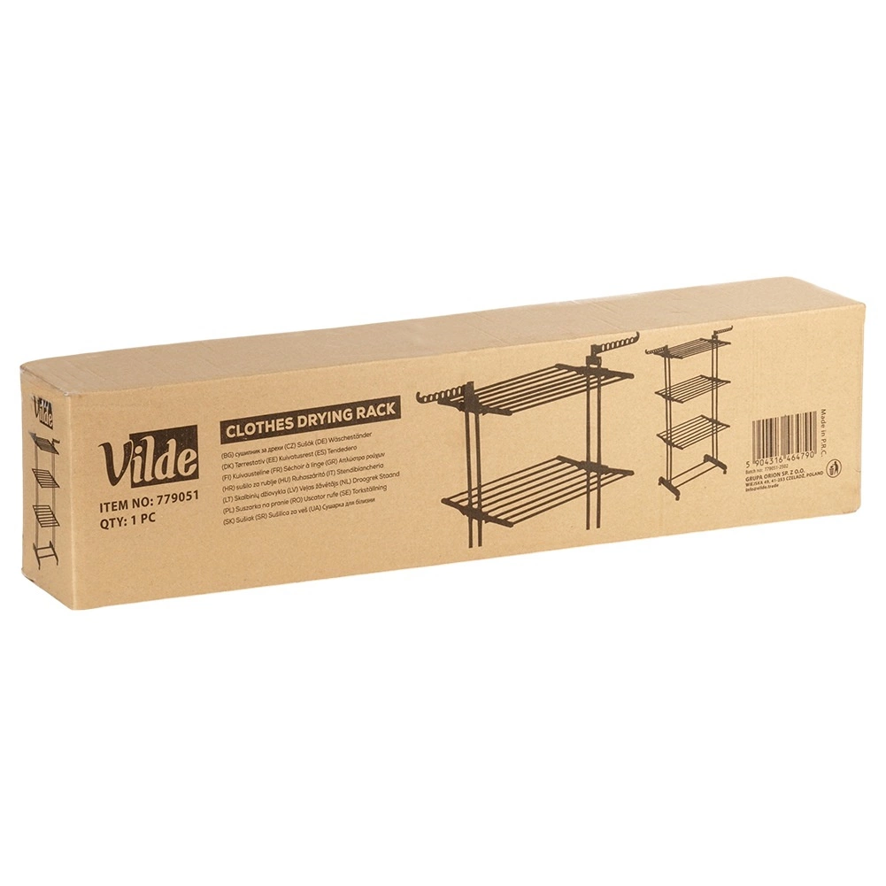 Maksimér pladsen ved tørring af vasketøj med det lodrette tørrestativ VILDE. Tre niveauer, seks uafhængigt nedklappelige vinger og to arme til bøjler gør det let at tilpasse tørringen til både små og store vaskemængder. Den stabile metalkonstruktion med pulverlakering udmærker sig ved fugtbestandighed og lang levetid.