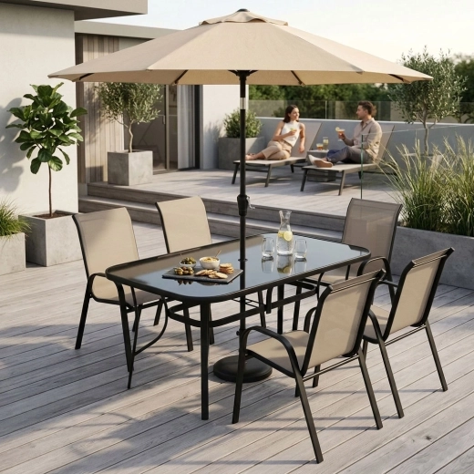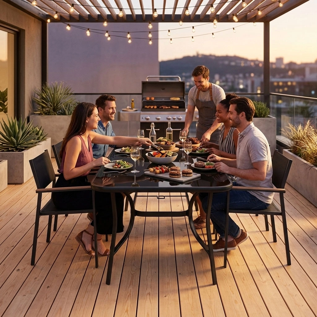 Skab en komfortabel udendørs spiseplads med det rummelige MultiGarden-bord. Den rektangulære glasplade på 160 × 90 cm giver rigelig plads til familiemåltider, kaffe med venner og grillhygge. Hærdet glas i en elegant sort ramme er robust, ridsebestandigt og let at rengøre.
