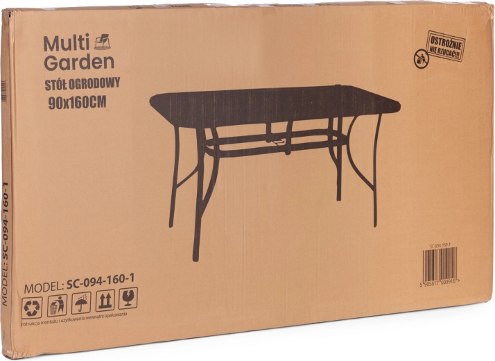 Elegant havebord fra MultiGarden med målene 160 × 90 cm, der tilbyder en rummelig overflade til spisning og afslapning på terrasse eller i haven. Bordpladen af hærdet glas er slidstærk og let at vedligeholde, mens den pulverlakerede stålkonstruktion sikrer stabilitet og lang levetid. Et praktisk parasolhul (4,5 cm) giver behagelig skygge på solrige dage. Bordet er vejrbestandigt og passer perfekt ind i et moderne uderum.