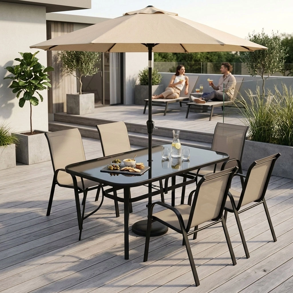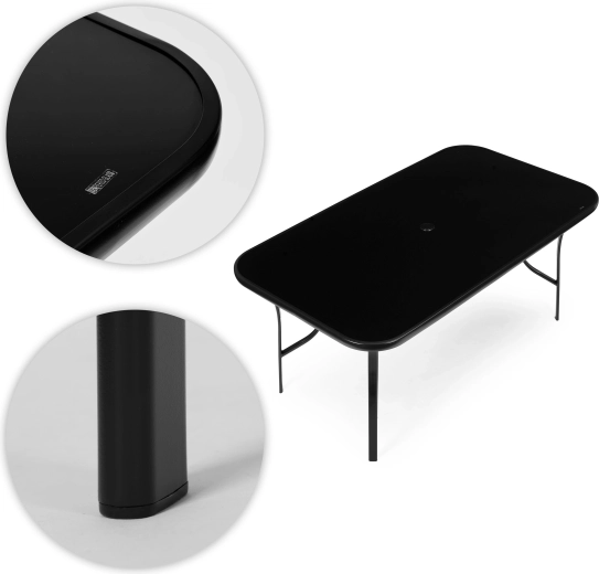 Den stabile base består af stålprofiler med pulverlakering, som beskytter mod fugt og rust. Konstruktionen forstærkes af en central tværstang, og skridsikre endestykker på benene øger stabiliteten og skåner underlaget. Det integrerede parasolhul på 4,5 cm med dæksel giver behagelig skygge på varme dage (parasol medfølger ikke).
