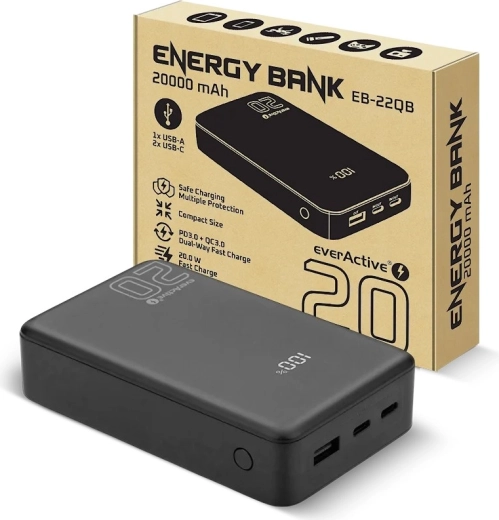 Pålidelig strømkilde til både rejse og kontor. Denne powerbank med 20.000 mAh kapacitet og op til 20 W effekt kan hurtigt oplade moderne smartphones, tablets og småelektronik. Med to USB‑C‑porte (indgang/udgang) og én USB‑A kan du nemt forsyne op til tre enheder samtidigt, mens LCD‑displayet præcist viser batteristatus.