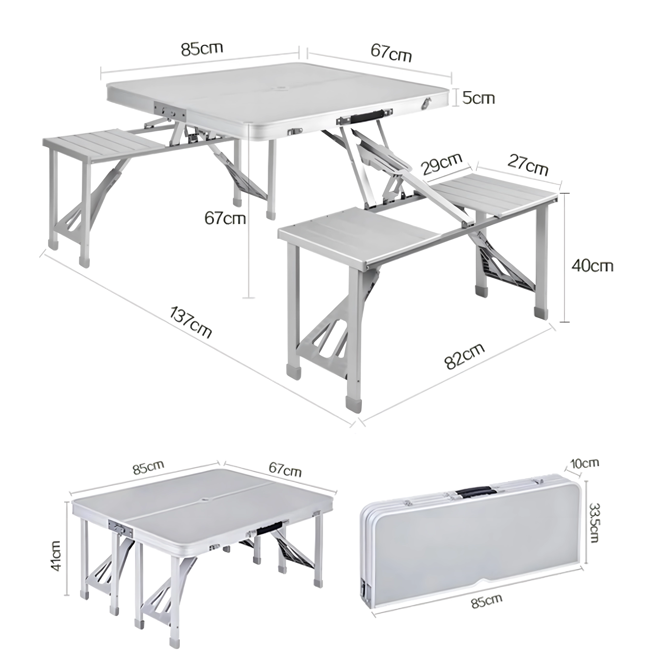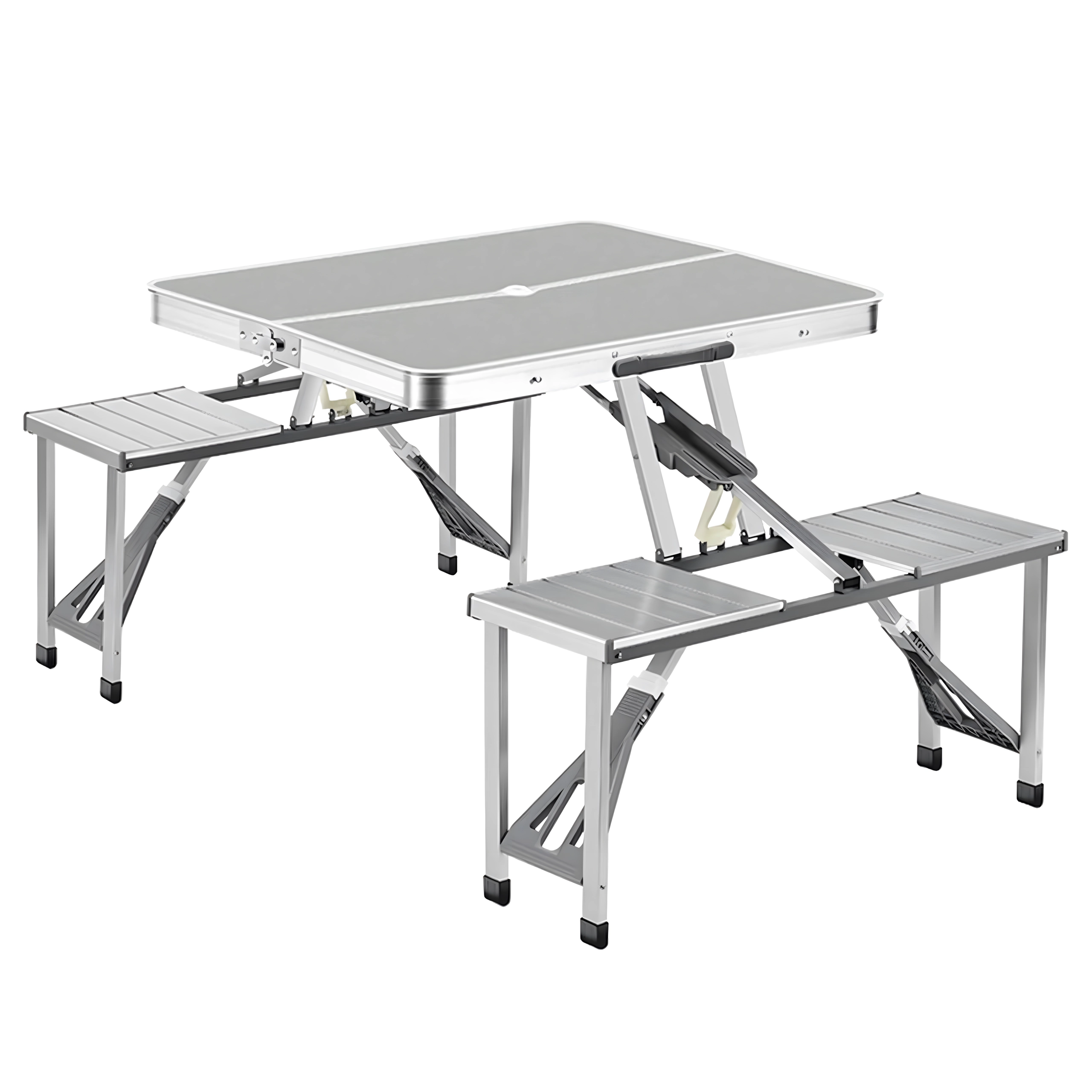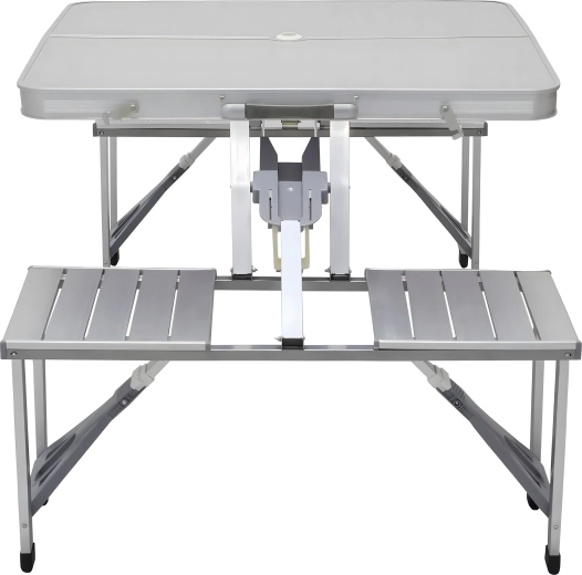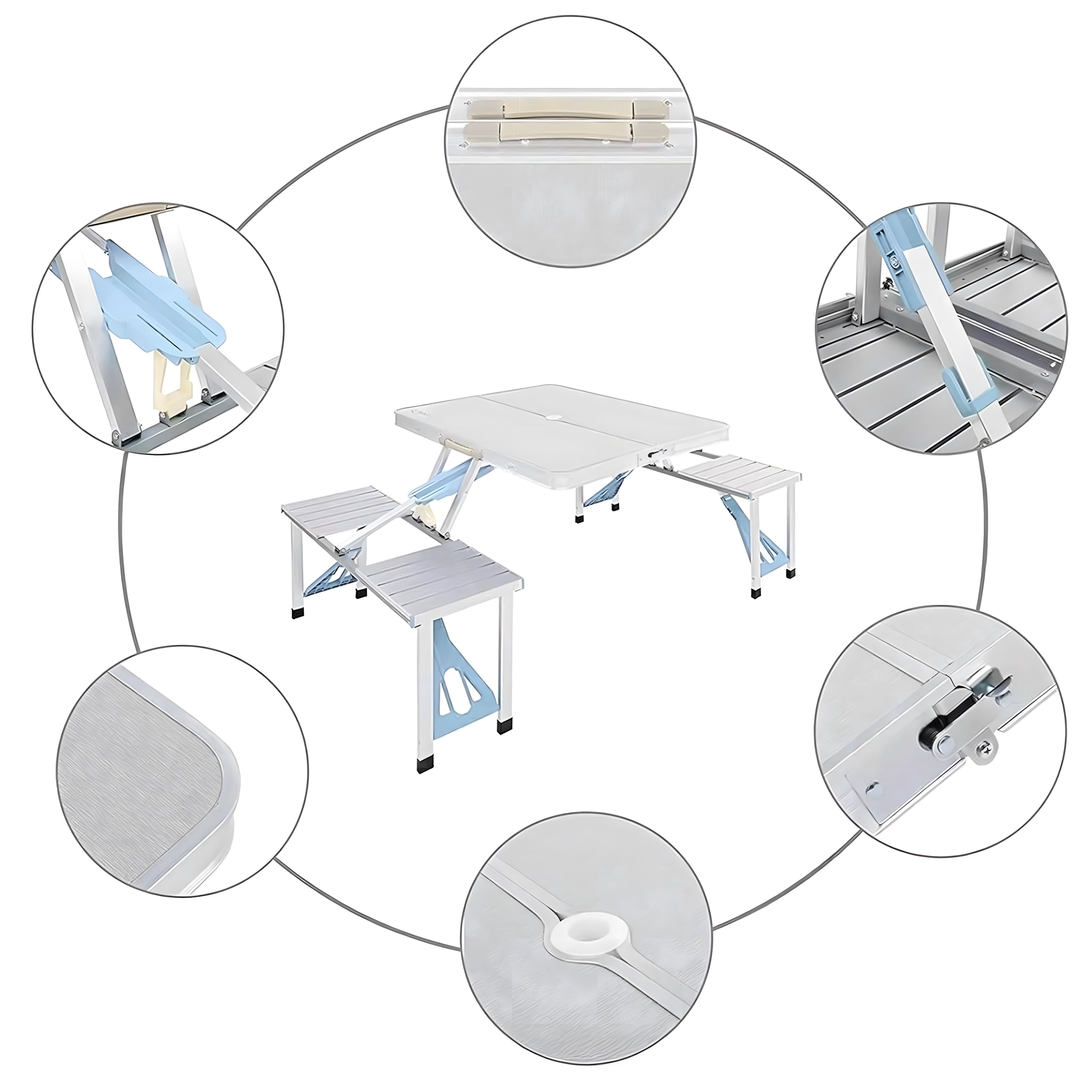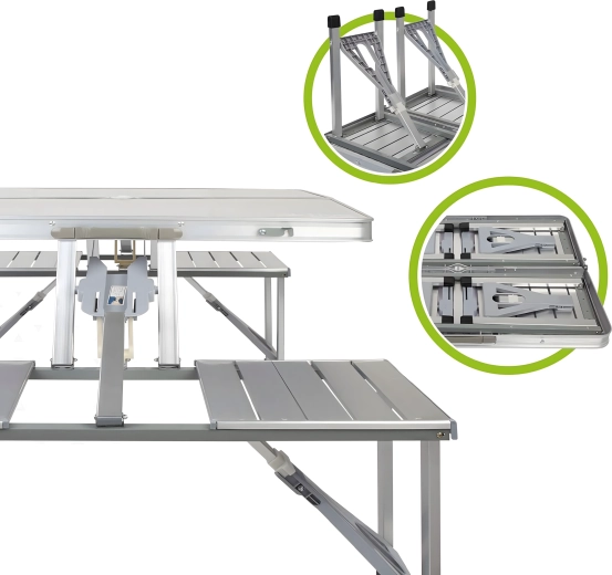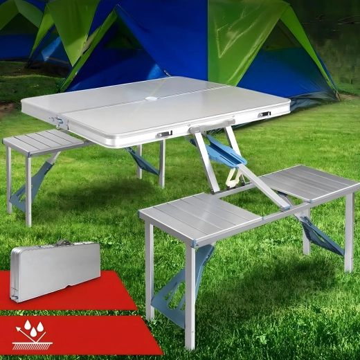 Praktisk og let sammenklappeligt campingbord med 4 integrerede sæder er ideelt til picnic, camping, strand og have. Den robuste kombination af aluminium og PVC sikrer lang holdbarhed, og efter sammenklapning forvandles hele sættet til en kompakt kuffert med bærehåndtag. Bordet har en parasolåbning, så du kan nyde behagelig skygge selv på varme dage.