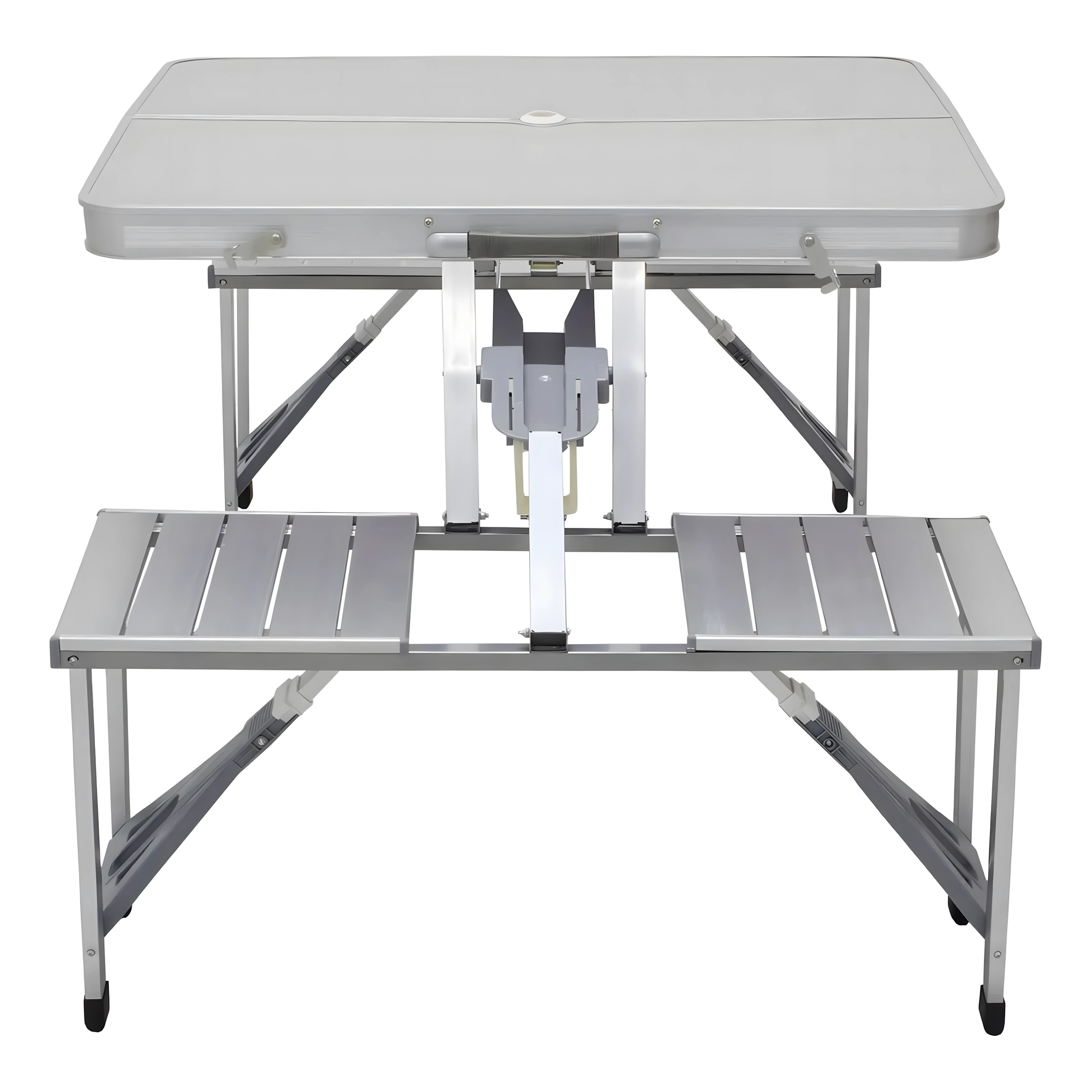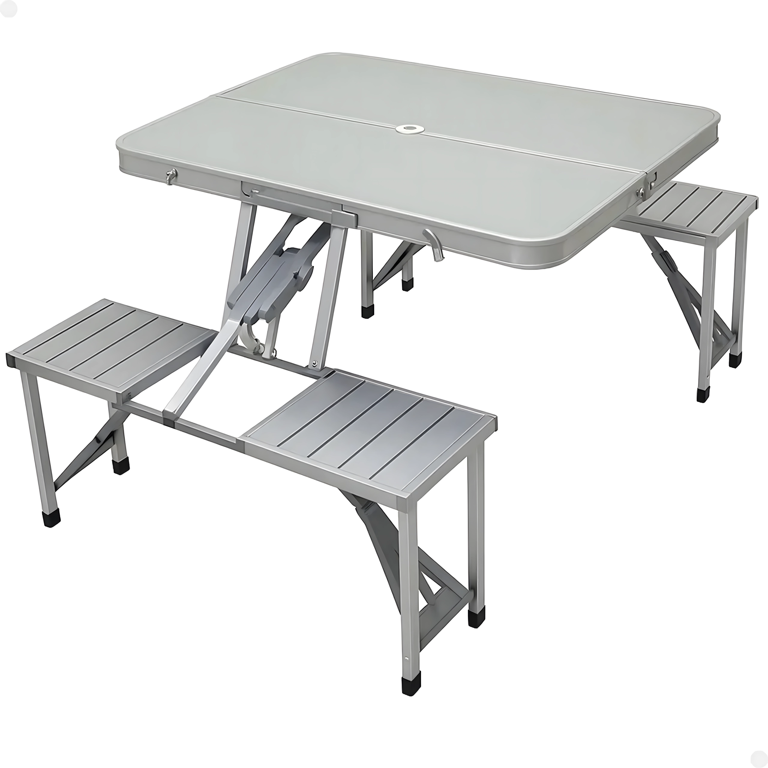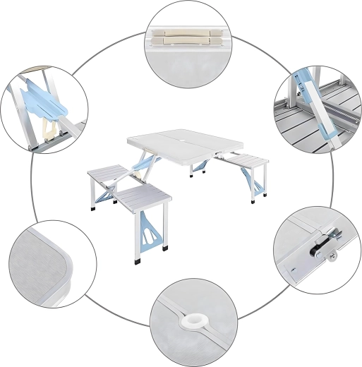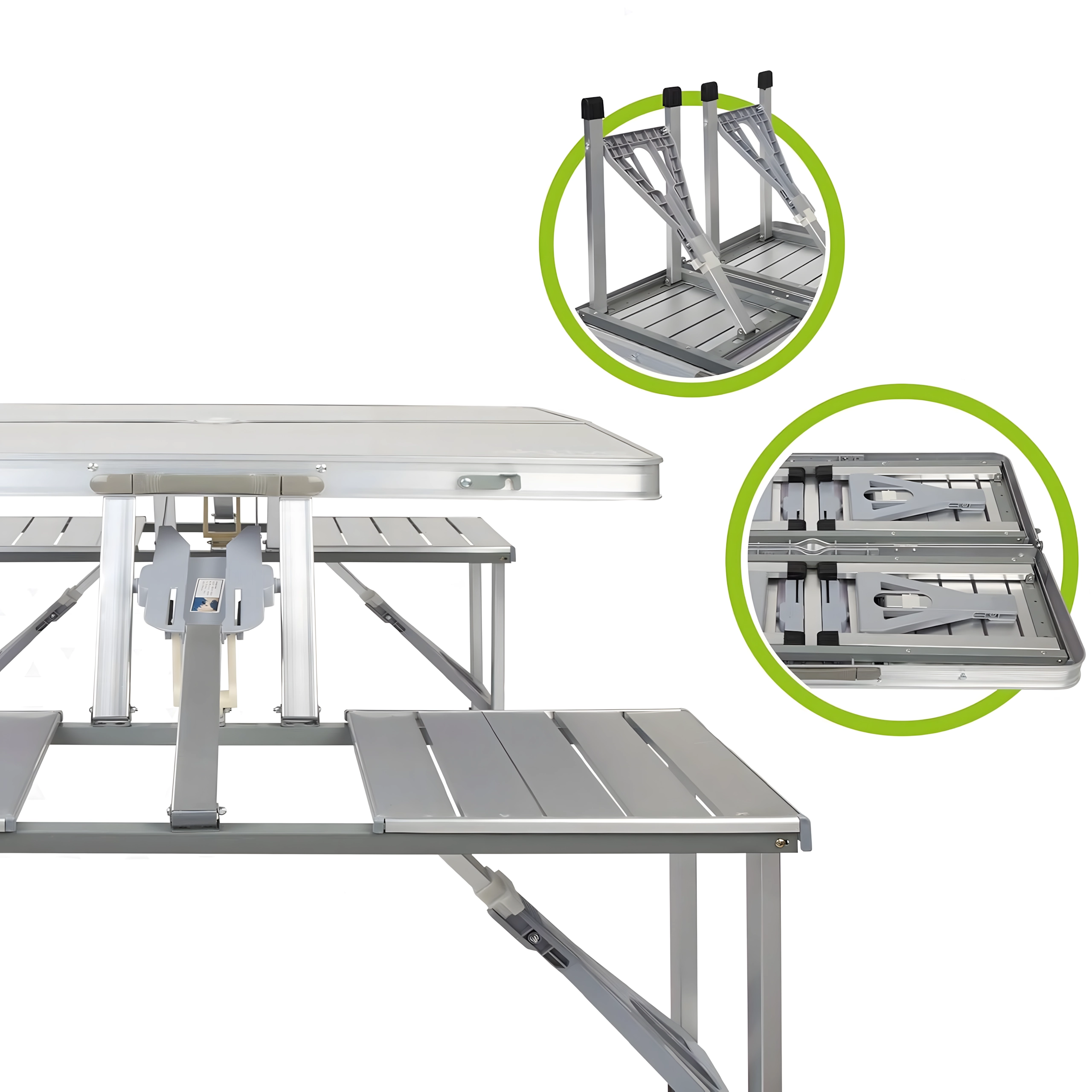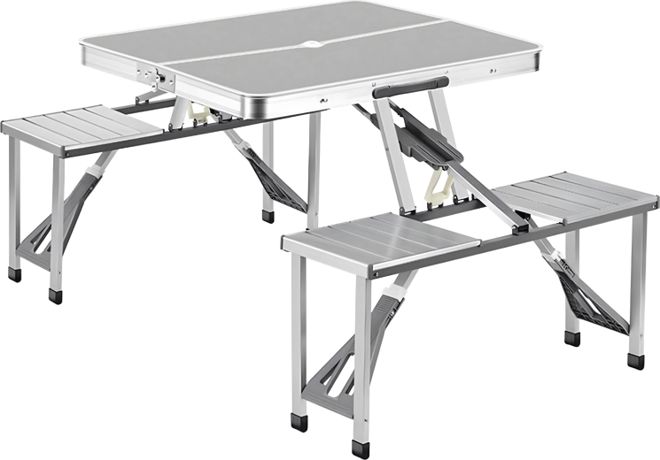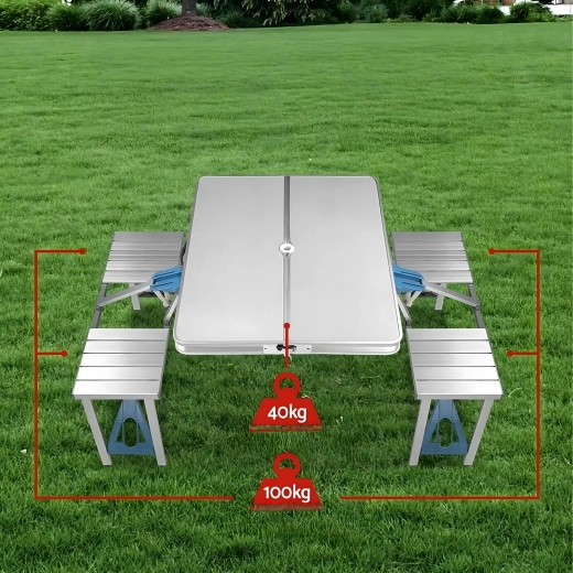 Praktisk og let sammenklappeligt campingbord med 4 integrerede sæder er ideelt til picnic, camping, strand og have. Den robuste kombination af aluminium og PVC sikrer lang holdbarhed, og efter sammenklapning forvandles hele sættet til en kompakt kuffert med bærehåndtag. Bordet har en parasolåbning, så du kan nyde behagelig skygge selv på varme dage.