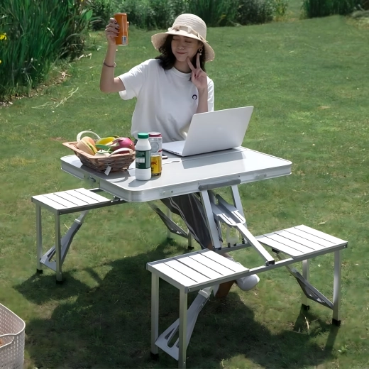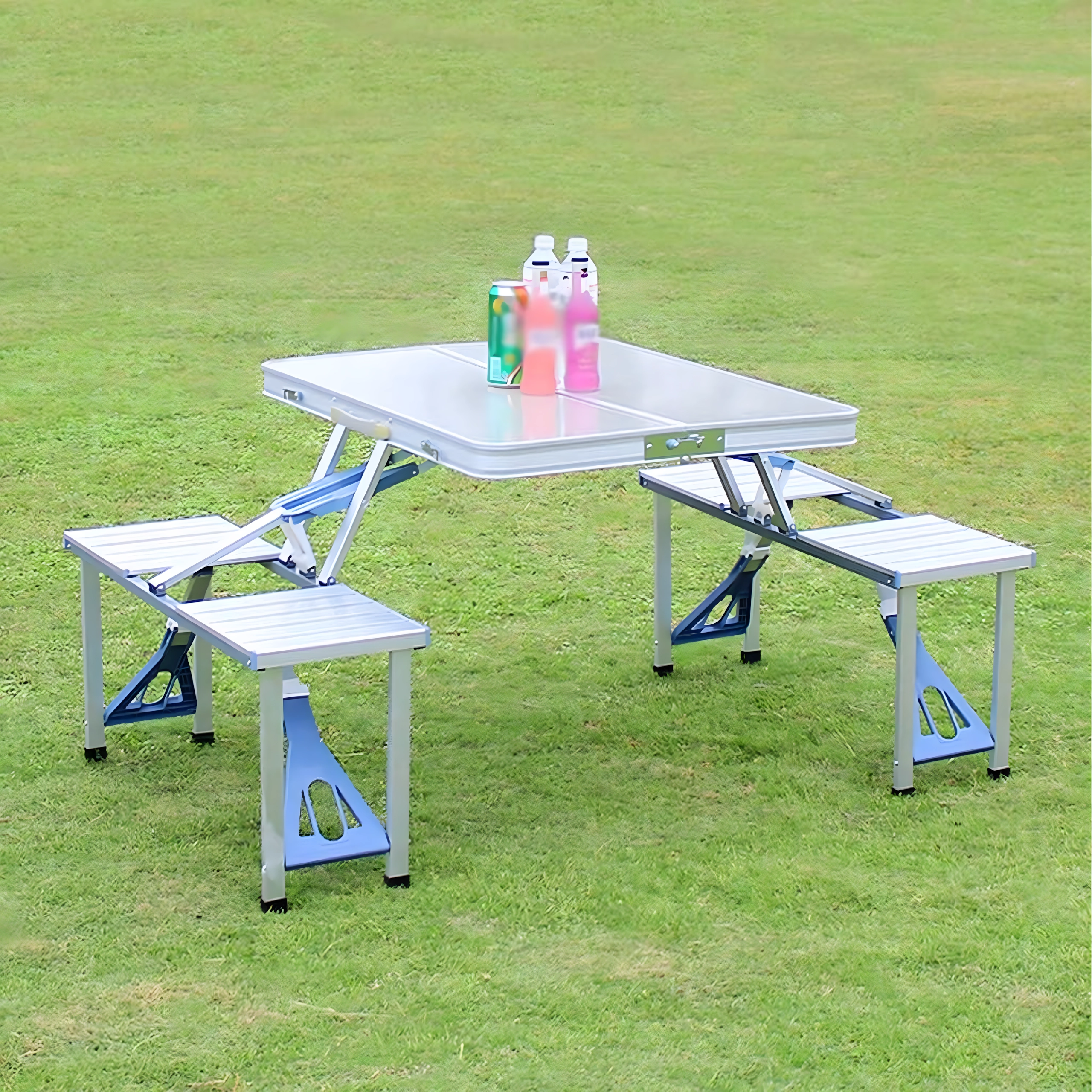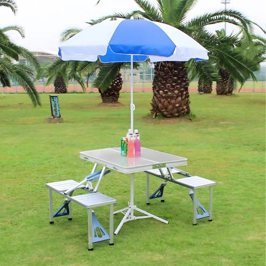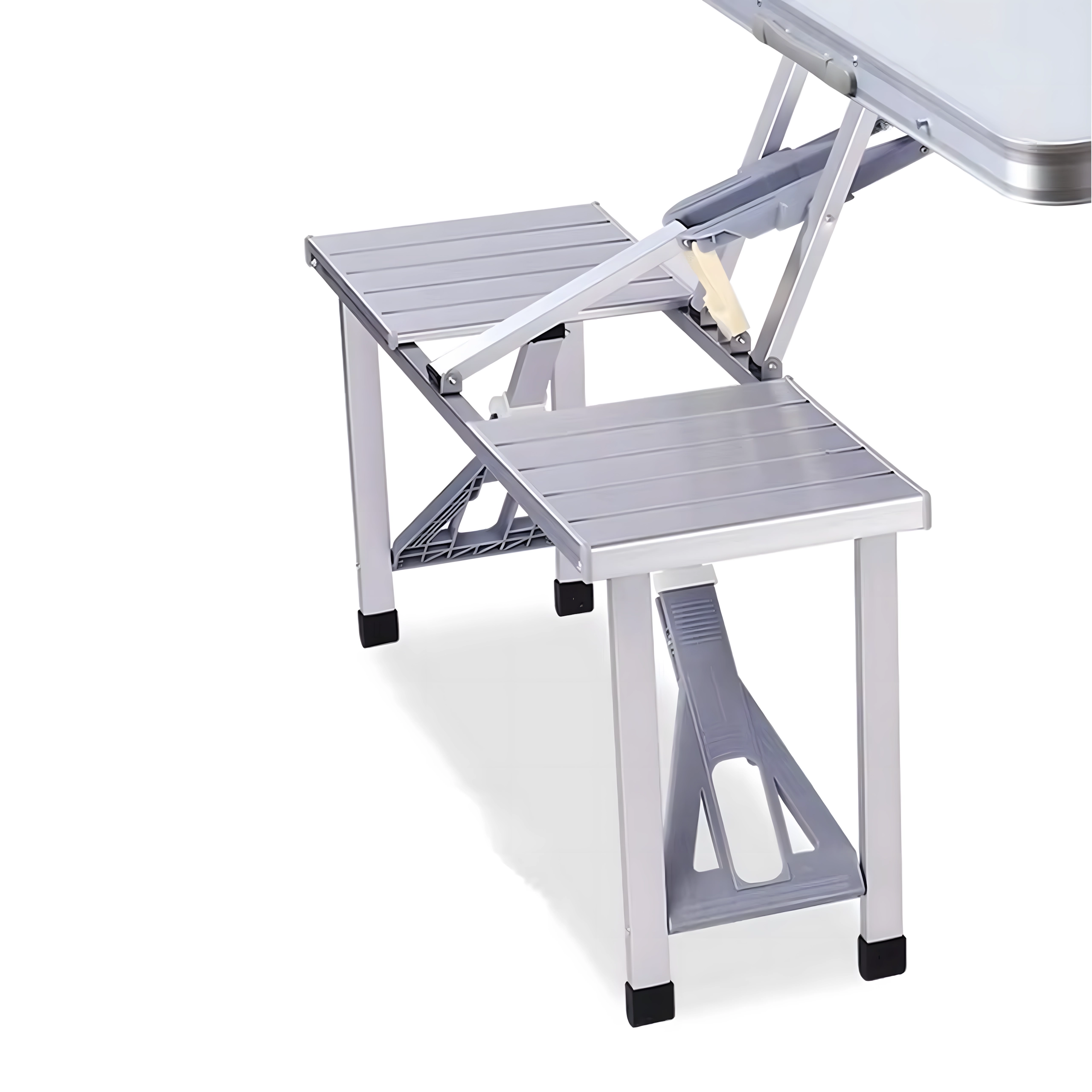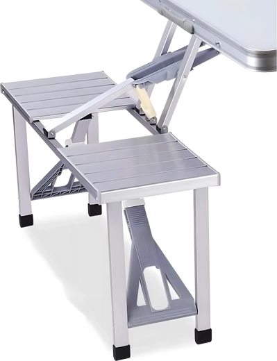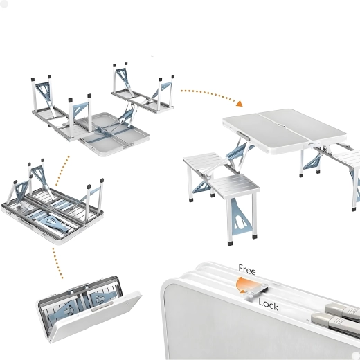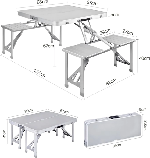 Praktisk og let sammenklappeligt campingbord med 4 integrerede sæder er ideelt til picnic, camping, strand og have. Den robuste kombination af aluminium og PVC sikrer lang holdbarhed, og efter sammenklapning forvandles hele sættet til en kompakt kuffert med bærehåndtag. Bordet har en parasolåbning, så du kan nyde behagelig skygge selv på varme dage.
