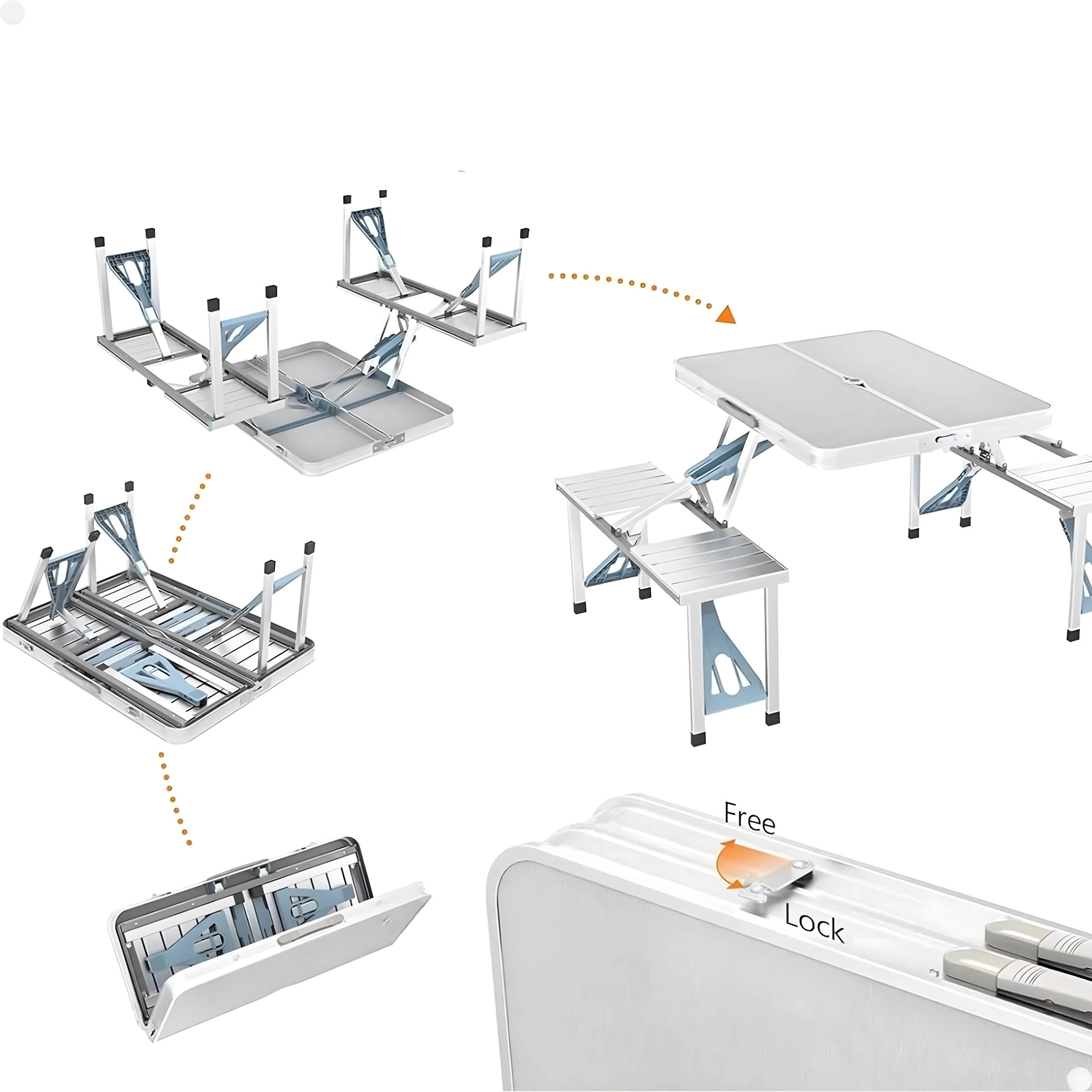 Bordet med fire integrerede sæder kan sættes op på et øjeblik – ideelt til picnic, camping og haven. Den kompakte løsning sparer både plads og tid.