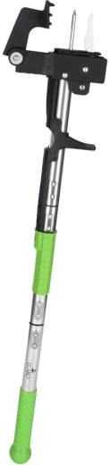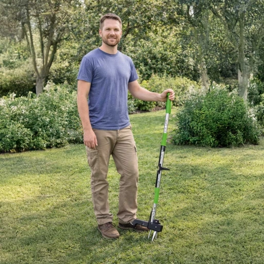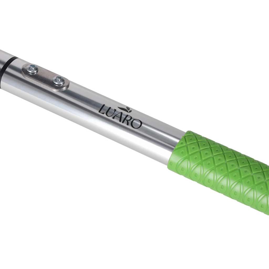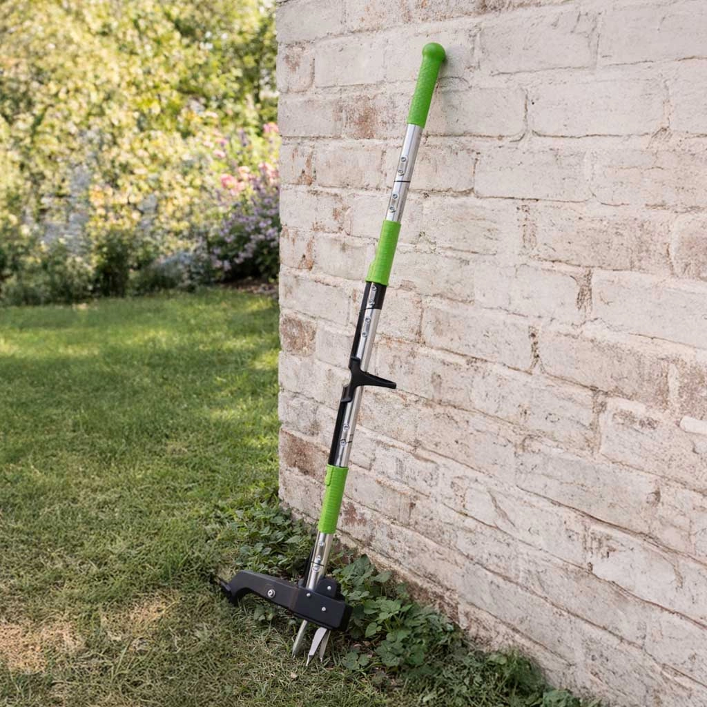 Det lange teleskopskaft og løftestangen ved hovedet gør det muligt at arbejde stående og skåne både ryg og knæ. Ideel til længere arbejde på plænen og i bedene.