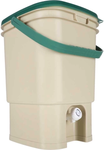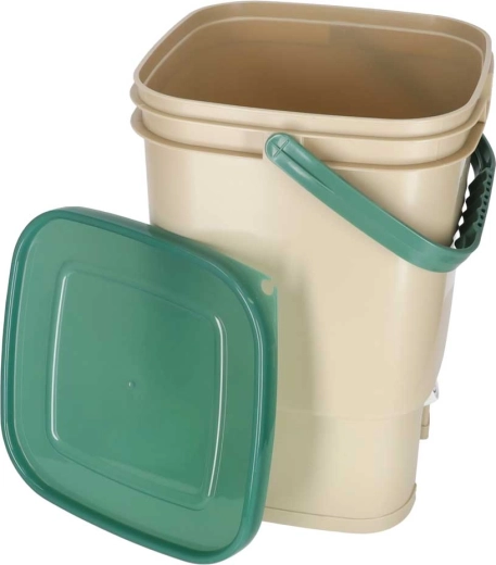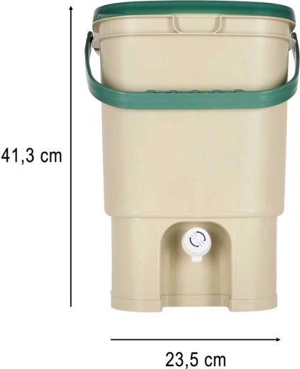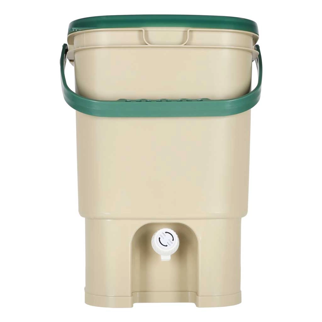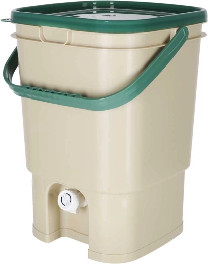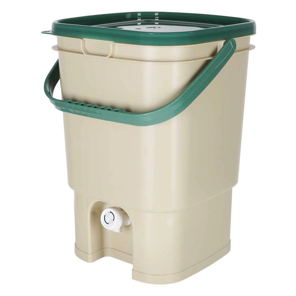 Den praktiske kompostbeholder til lejlighed og hus gør det muligt hygiejnisk at samle organiske rester (skræller, kaffegrums, teposer, æggeskaller m.m.) ét sted. Det solide låg begrænser spredning af lugte, den indvendige perforerede indsats adskiller fast materiale fra væsker, og den nederste hane gør det nemt at tappe den næringsrige udtræk.