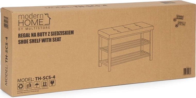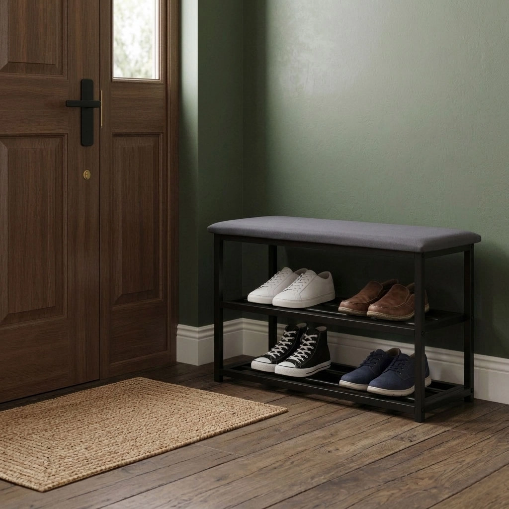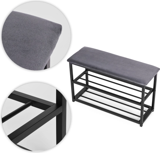 Sædet består af en MDF-plade, et lag skum og et velourstof med en samlet tykkelse på ca. 3 cm – behageligt at røre ved, elegant at se på og komfortabelt, når du tager sko på og af. Det åbne hyldedesign giver hurtig adgang og bedre luftcirkulation, så sko tørrer lettere og forbliver friske.