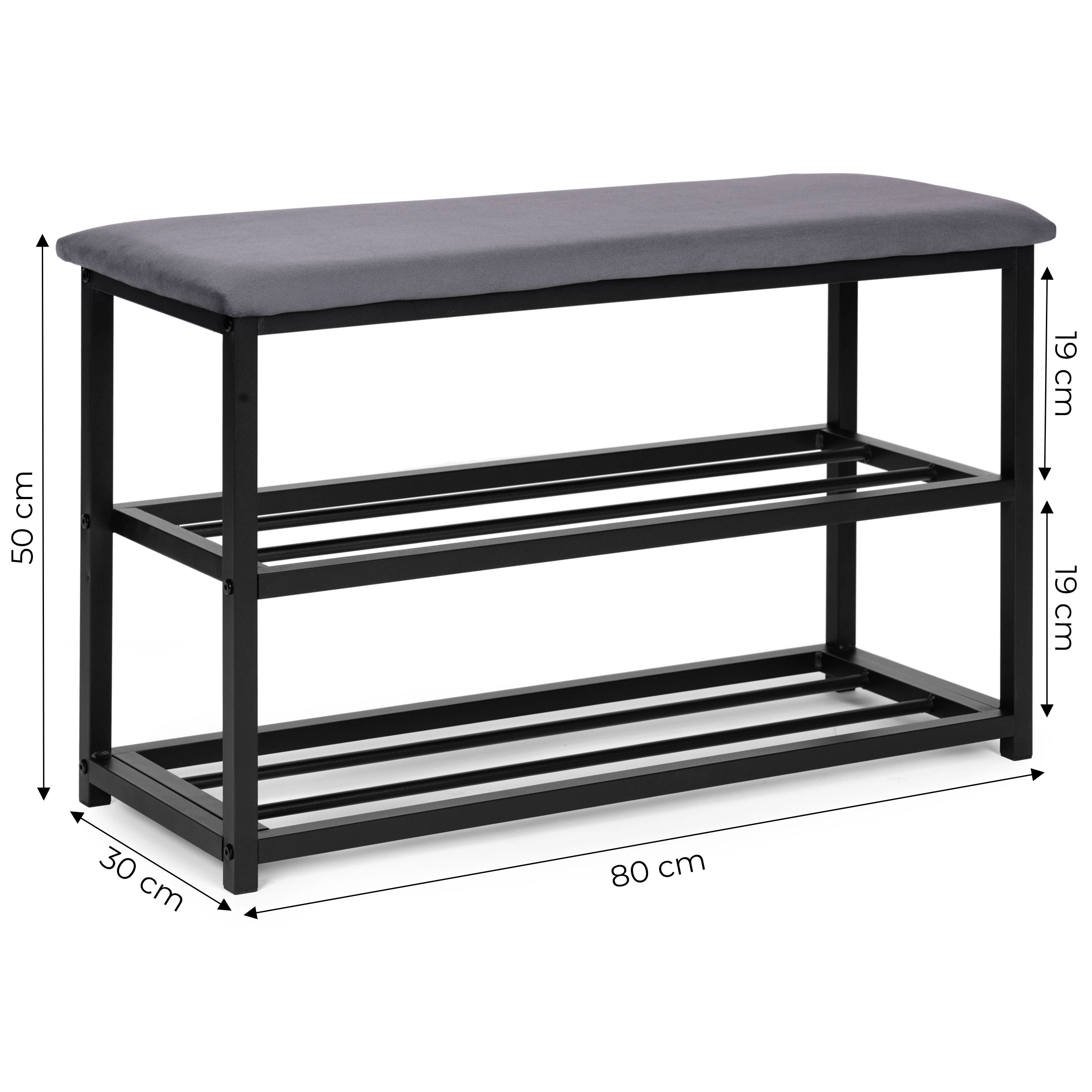 Skab orden og stil i entreen. Denne skobænk med en bredde på 80 cm tilbyder komfortabel siddeplads og to rummelige riste til hverdagssko. Stålkonstruktionen med mat sort lak er modstandsdygtig over for daglig brug og passer perfekt ind i moderne interiører.