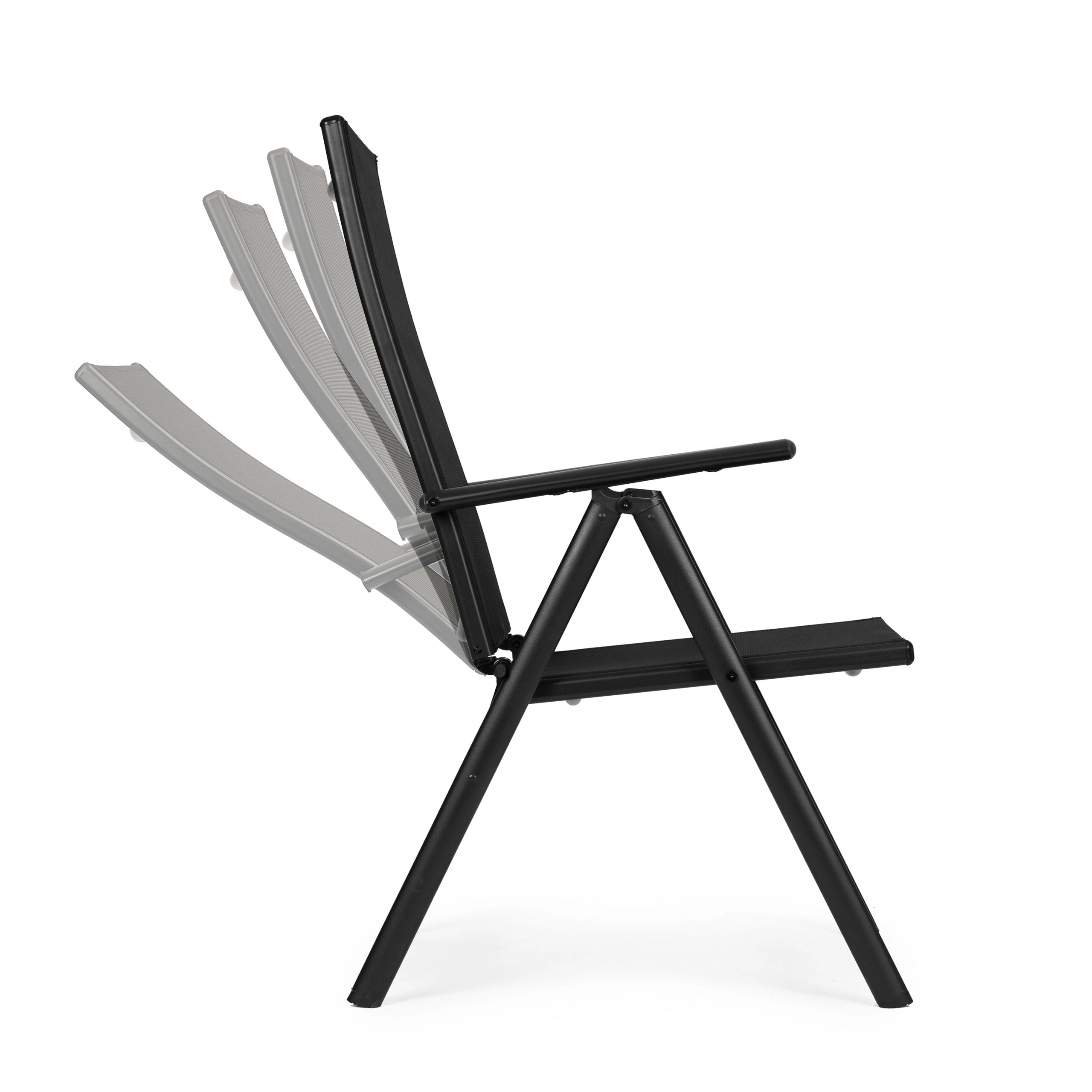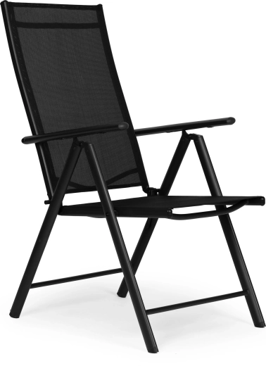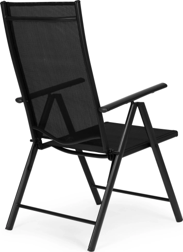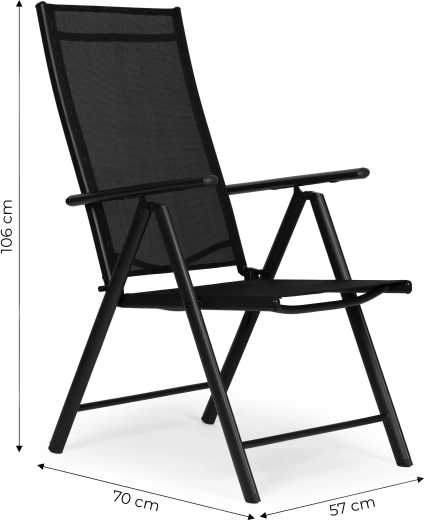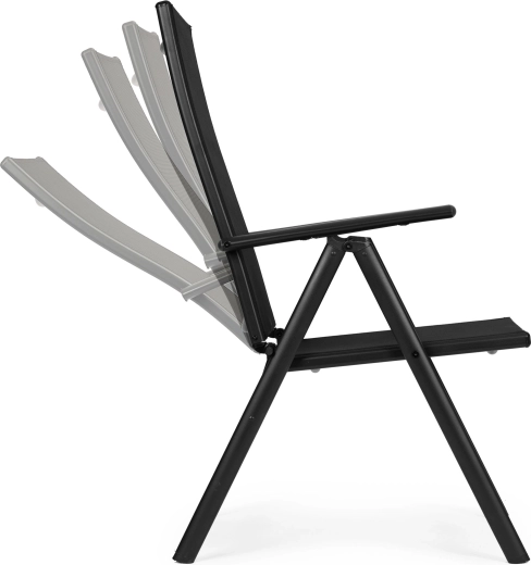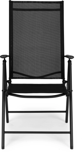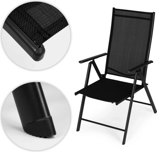 Takket være den sammenklappelige konstruktion sparer stolen plads og er klar til camping, picnic og ferie. Beskyttende fodkapper minimerer risikoen for at ridse gulv og terrasse. Det moderne sorte design passer til de fleste havesæt og er let at vedligeholde.