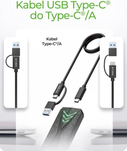 Pakken indeholder et kombineret 60 cm USB‑C til USB‑C/USB‑A‑kabel, som sikrer bred kompatibilitet med både nyere og ældre enheder uden behov for ekstra adaptere. Kabinettet er designet til M.2 NVMe PCIe‑SSD med M‑ eller B+M‑nøgle og understøtter kapacitet op til 2 TB.