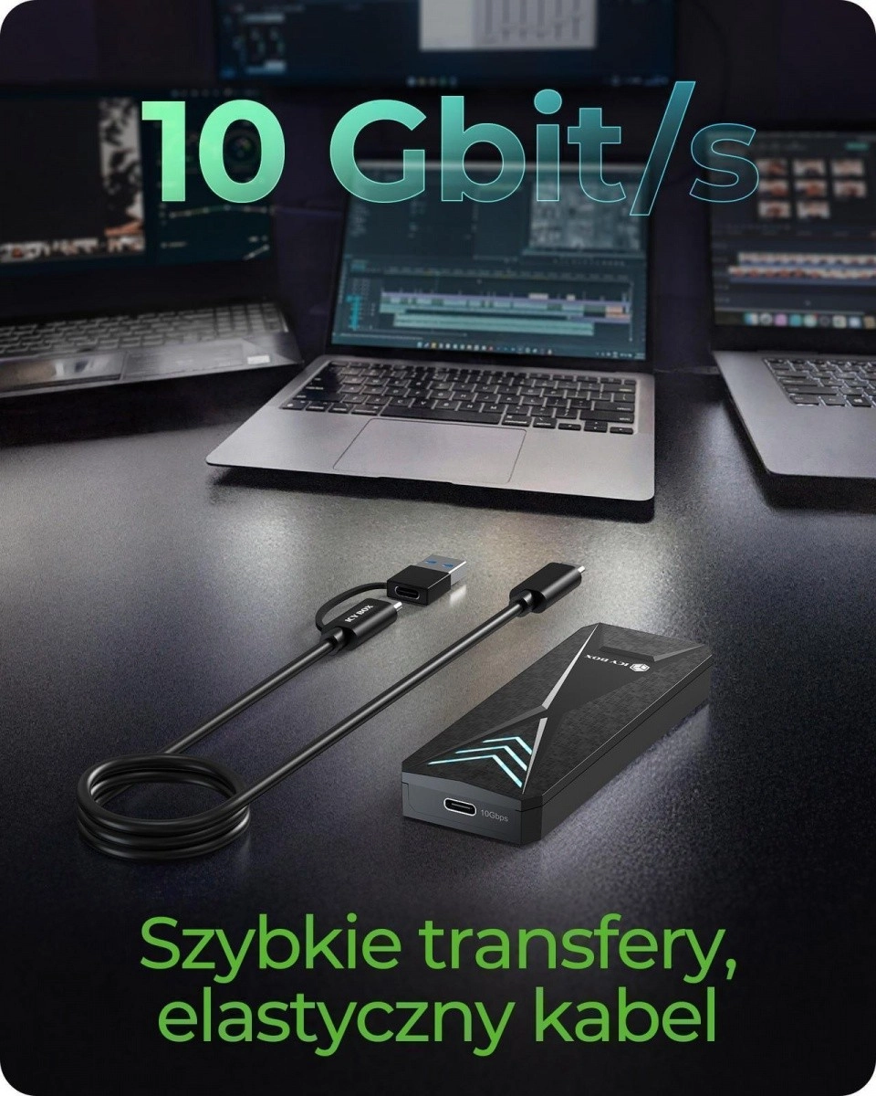 Løft dit skrivebord og få hurtig dataoverførsel med et elegant kabinet til NVMe M.2‑SSD. Integreret RGB‑belysning angiver strøm og aktivitet og giver dit setup et personligt præg. Med USB 3.2 Gen 2 opnår du teoretiske hastigheder op til 10 Gb/s for hurtig kopiering af store filer og arbejde med medier.