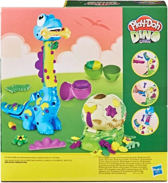 Hjælp den lille Bronto ud af ægget, og se halsen vokse! Fyld PLAY-DOH-figuren og tryk på halen – halsen skydes op, og legen kan begynde. Med formene på figuren og ægget kan du lave blade, blomster, knogler og en stilfuld sløjfe.