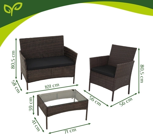 Det elegante sofabord med hærdet glas (5 mm) er praktisk til servering af drikkevarer og snacks og er nemt at rengøre – det er nok med en fugtig klud og et mildt rengøringsmiddel. Sættet passer til terrasser, altaner og haver, og takket være det enkle monteringssystem med illustreret vejledning og QR‑video samler du det hurtigt.