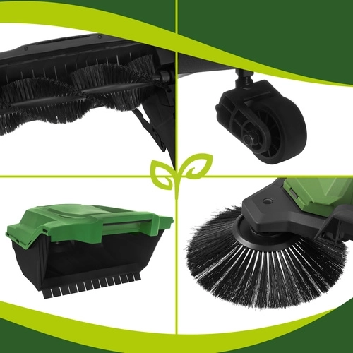 Med en arbejdsbredde på 680 mm og en kapacitet på op til 2100 m²/t rengør du større arealer på kortere tid. Det trehjulede chassis med store baghjul (200 mm) og et forreste styrehjul gør manøvreringen let. Hurtig justering af håndtagets vinkel giver komfortabelt arbejde for brugere i forskellige højder, og det foldbare greb muliggør kompakt opbevaring.