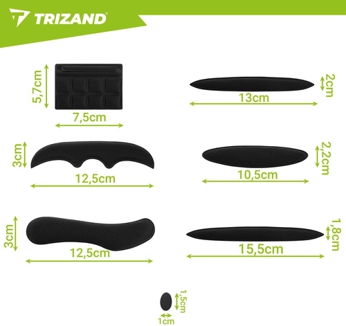Optimer pasformen og komforten i din hjelm på få minutter. Det universelle TRIZAND-sæt indeholder 54 dele i forskellige former til pande, sider, isse og nakke. Det lette og åndbare EVA-skum dæmper tryk på kritiske steder, øger hjelmens stabilitet og sikrer bedre svedtransport selv på længere ture.