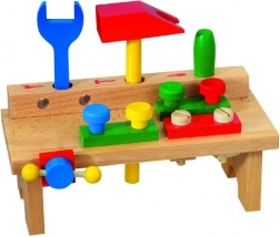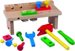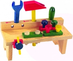 Sættet indeholder alt, hvad der er nødvendigt for sikker og sjov leg: skruetrækker, hammer, nøgle, møtrikker og skruer. Alt er fremstillet af kvalitets træ med en glat overflade for behagelig og sikker brug. Pakket i en papæske, også velegnet som gave.