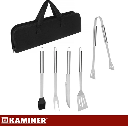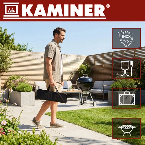 Det praktiske grillsæt fra KAMINER holder alt samlet i et solidt etui, så du altid har værktøjerne lige ved hånden. Indeholder 5 grundlæggende redskaber i rustfrit stål med lange håndtag for mere sikker brug tæt på varmen; hvert stykke har en krog til ophæng. Takket være det organiserede etui med elastiske holdere er transport og opbevaring hurtig og overskuelig.