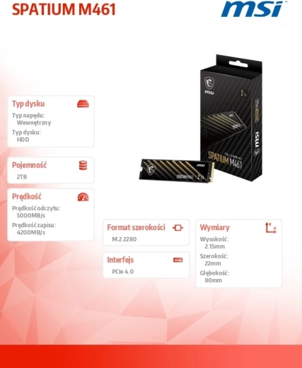 MSI SPATIUM M461 leverer moderne lagerplads med høj båndbredde via PCIe 4.0 til lynhurtig indlæsning af system, spil og krævende apps. 3D NAND-teknologi kombinerer kompakte mål med høj kapacitet, så du får op til 2 TB plads uden kabler – direkte i M.2-slotten.