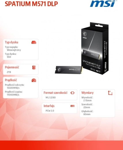 Giv din computer et boost med NVMe SSD MSI SPATIUM M571 DLP – kapacitet 2 TB, interface PCIe 5.0 og formfaktor M.2 2280 for ekstreme overførselshastigheder op til 14.500 MB/s læsning og 11.000 MB/s skrivning. Robust konstruktion og integreret køler for stabil ydeevne ved krævende spil og arbejde.