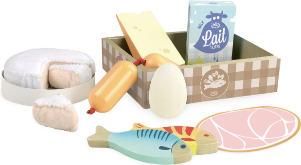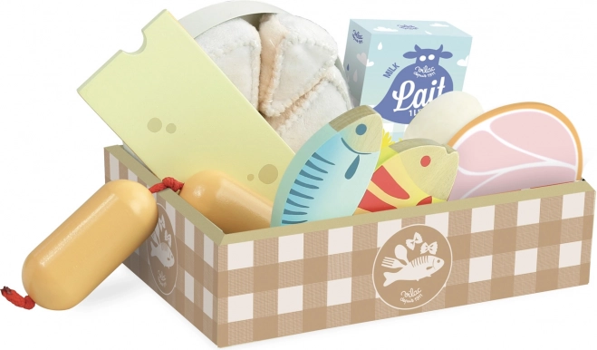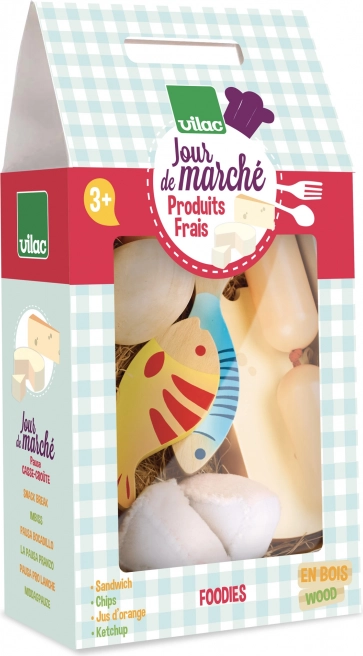 Alle dele er omhyggeligt fremstillet af træ, hvilket sikrer deres holdbarhed og sikkerhed under leg. Børnene kan nyde realistisk leg, mens de lærer om madvarer og deres anvendelse.
