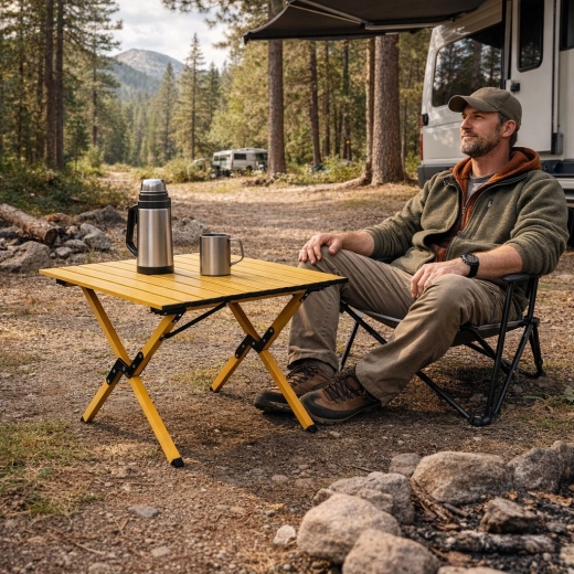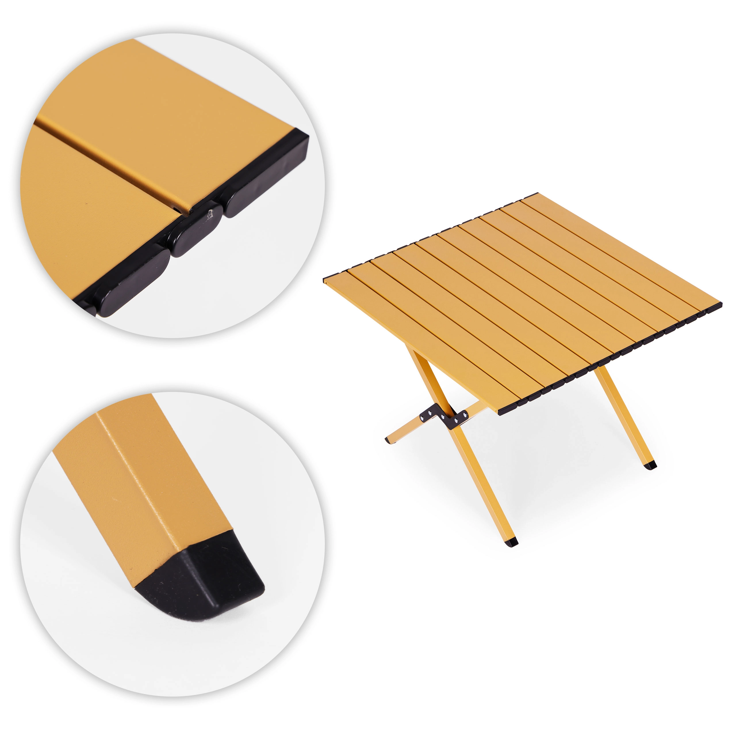 Bordet foldes ud og sammen på et øjeblik, og takket være låse-/areteringsdele står det sikkert på plads. Skridsikre fødder øger stabiliteten på græs, jord og terrasse. Efter brug pakker du det hele let i den medfølgende taske – den perfekte løsning til camping, ved vandet og i haven.