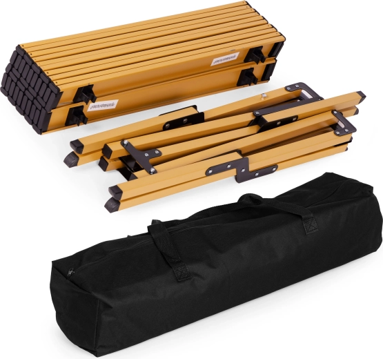 Lamelbordpladen fastgøres nemt med låseklips, som forbinder den solidt med rammen. Montering og sammenklapning klares på et øjeblik, uden værktøj.