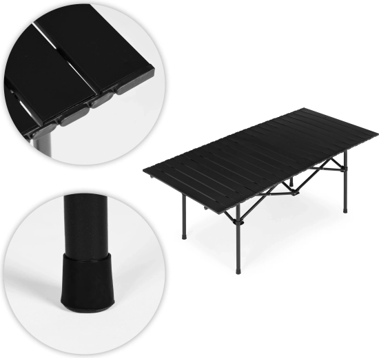 Den lamelopbyggede (rullbare) bordplade giver en behageligt plan overflade, der er let at rengøre og leder vandet godt væk. Skridsikre fødder øger stabiliteten på græs, jord og fliser. Hurtig samling uden værktøj og kompakte mål i pakket tilstand gør det til et ideelt bord til udflugter, picnics og grill.