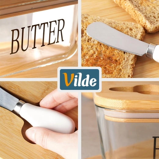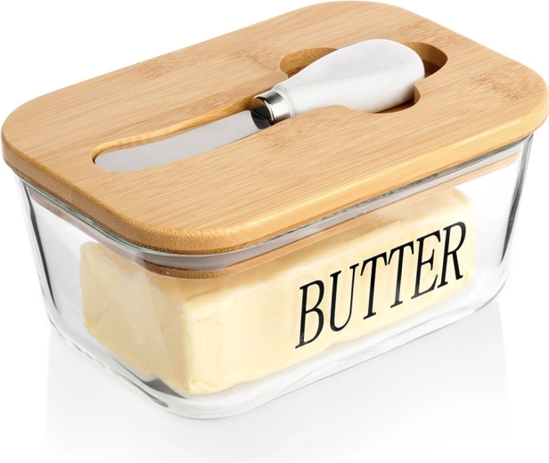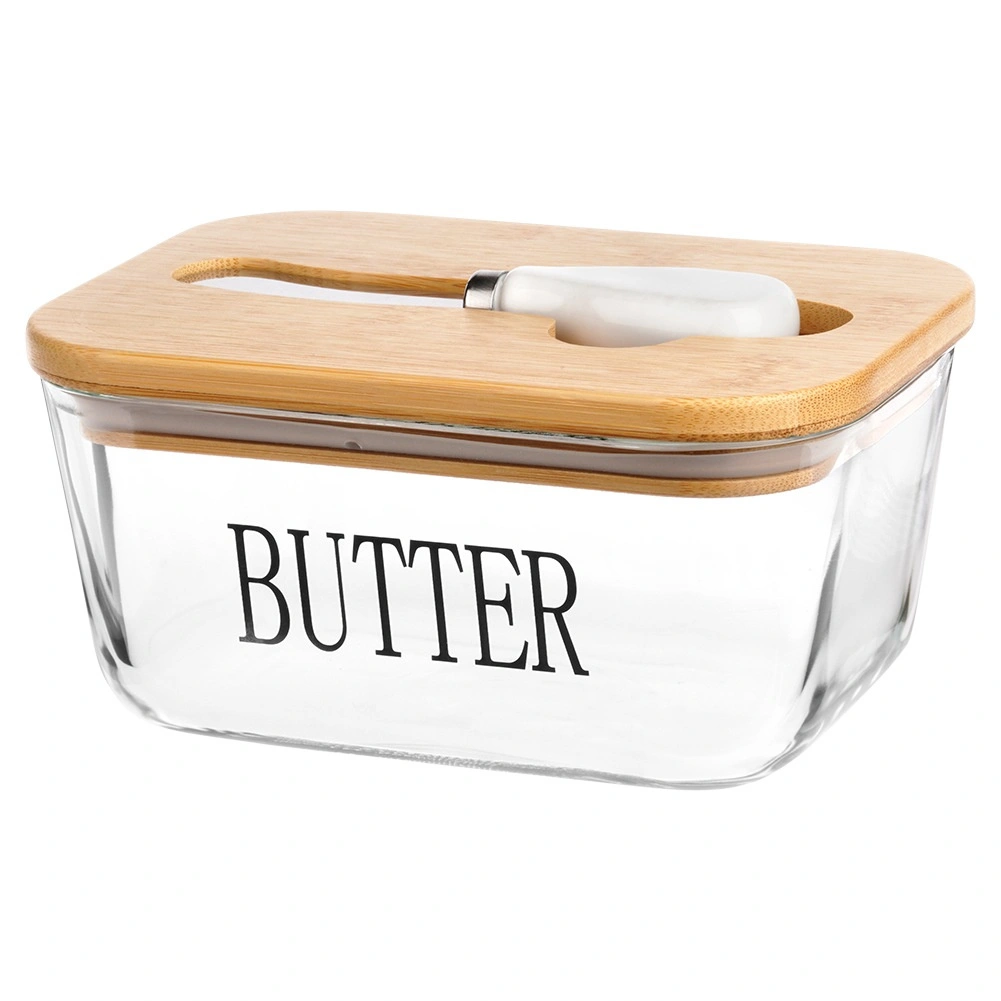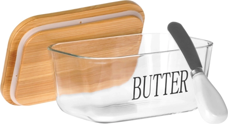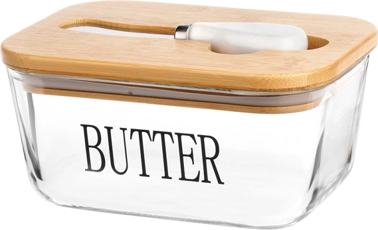 Klart glas med teksten BUTTER og naturlig bambus skaber et elegant tilbehør til både bordet og køleskabet. Det klassiske formsprog passer i ethvert køkken.