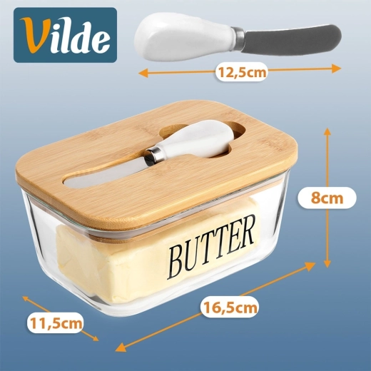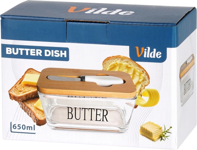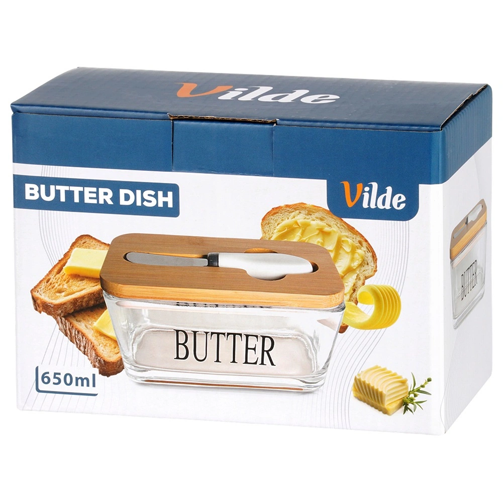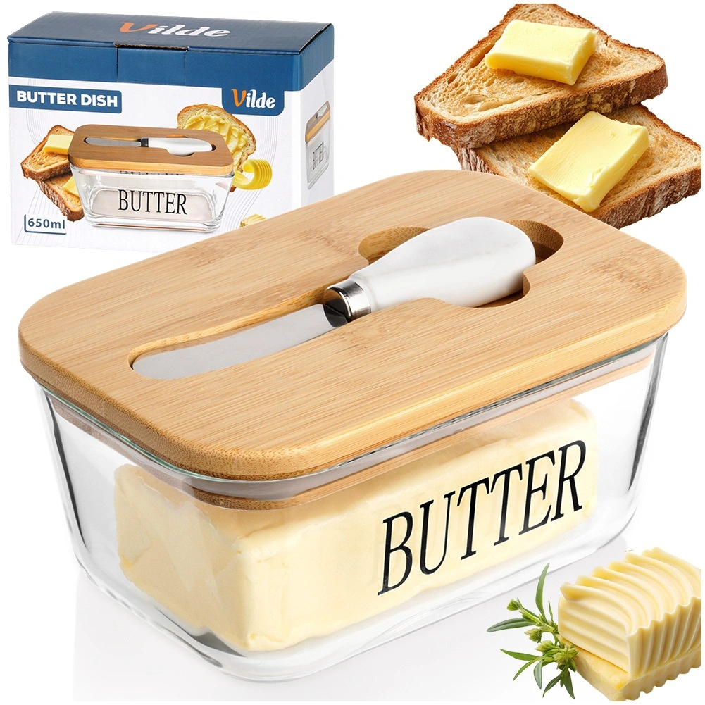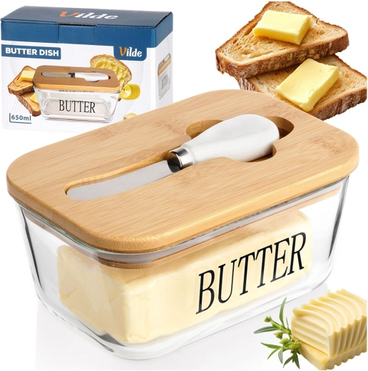 Volumen 650 ml, mål 16,5 × 11,5 × 8 cm. Glasdelen tåler opvaskemaskine og mikroovn til hurtig opvarmning af smør.