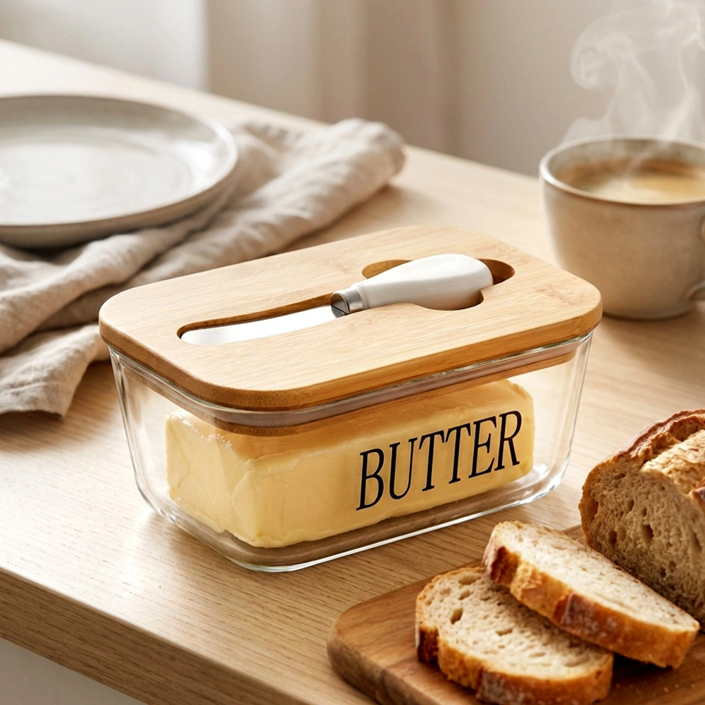 Denne praktiske margarineboks kombinerer et rent design med daglig funktionalitet. Det gennemsigtige glas fremhæver indholdet, bambuslåget bevarer friskheden, og på siden finder du den markante tekst BUTTER. En integreret udskæring i låget holder smørkniven sikkert på plads, så du altid har alt ved hånden.