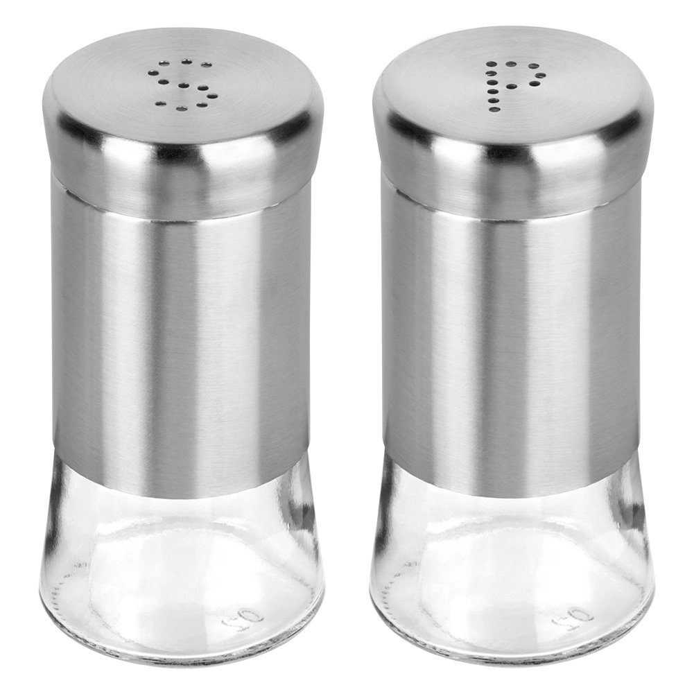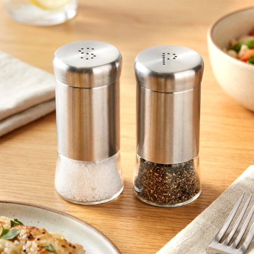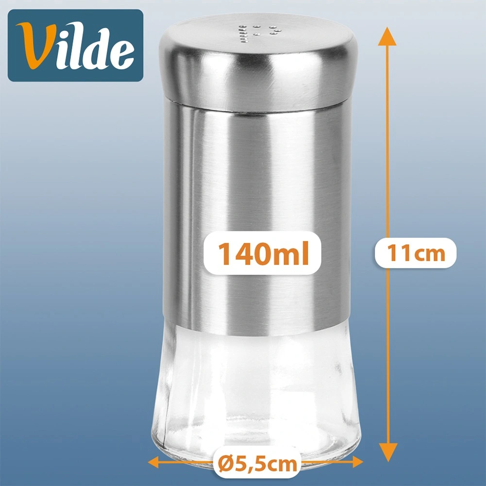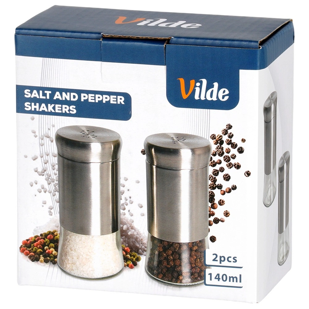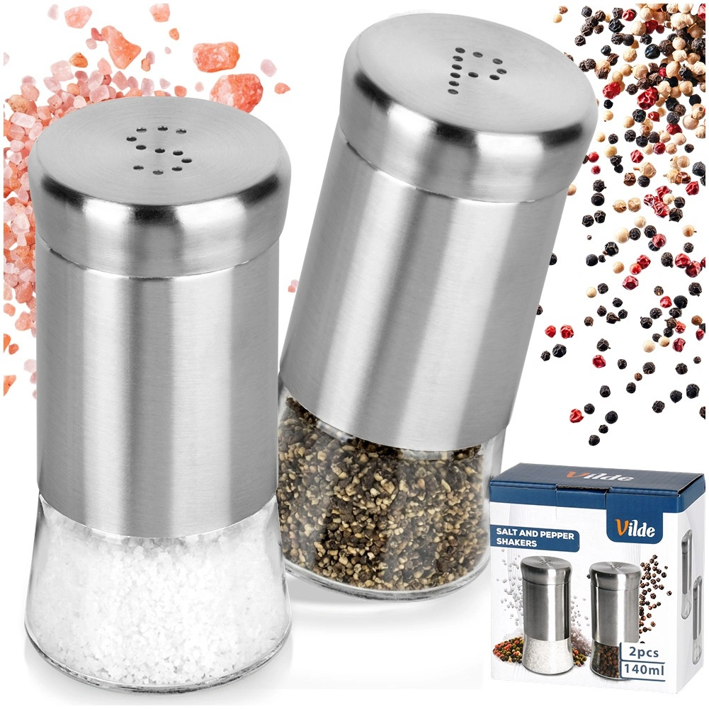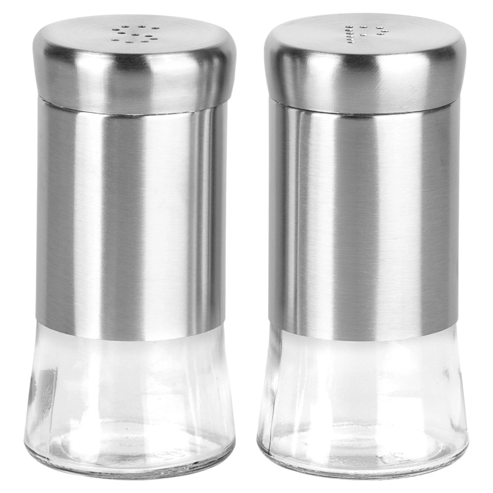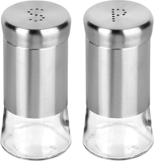 Sættet med salt- og peberdrysser er fremstillet af kvalitetsklart glas med øverste del og låg i rustfrit stål i en elegant sølvfarve. Praktiske perforeringer, der danner bogstaverne S og P, giver bekvem og jævn dosering uden risiko for oversaltning eller for meget krydderi.