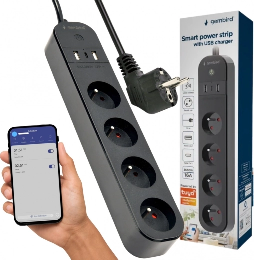 Den smarte WiFi-forlængerlist fra Tuya tilbyder 4 individuelt styrbare 230 V-udtag, 2× USB‑A og 1× USB‑C til hurtig opladning samt måling af energiforbrug. Med Smart Life / Tuya Smart-appen kan du tænde og slukke enheder eksternt, opsætte tidsplaner, automatiseringer og dele adgangen med familien – ideel til stue, kontor, gaminghjørne og børneværelse.