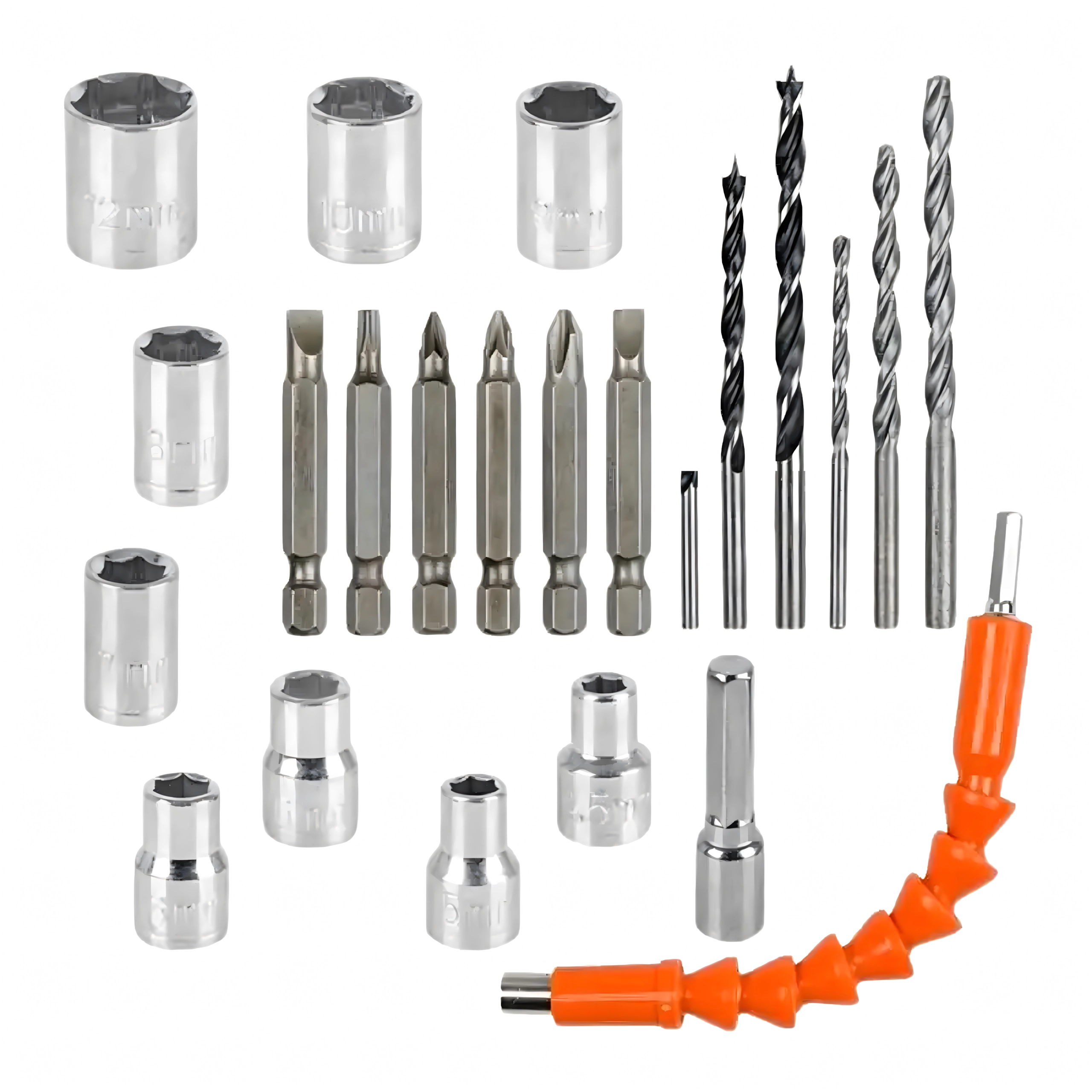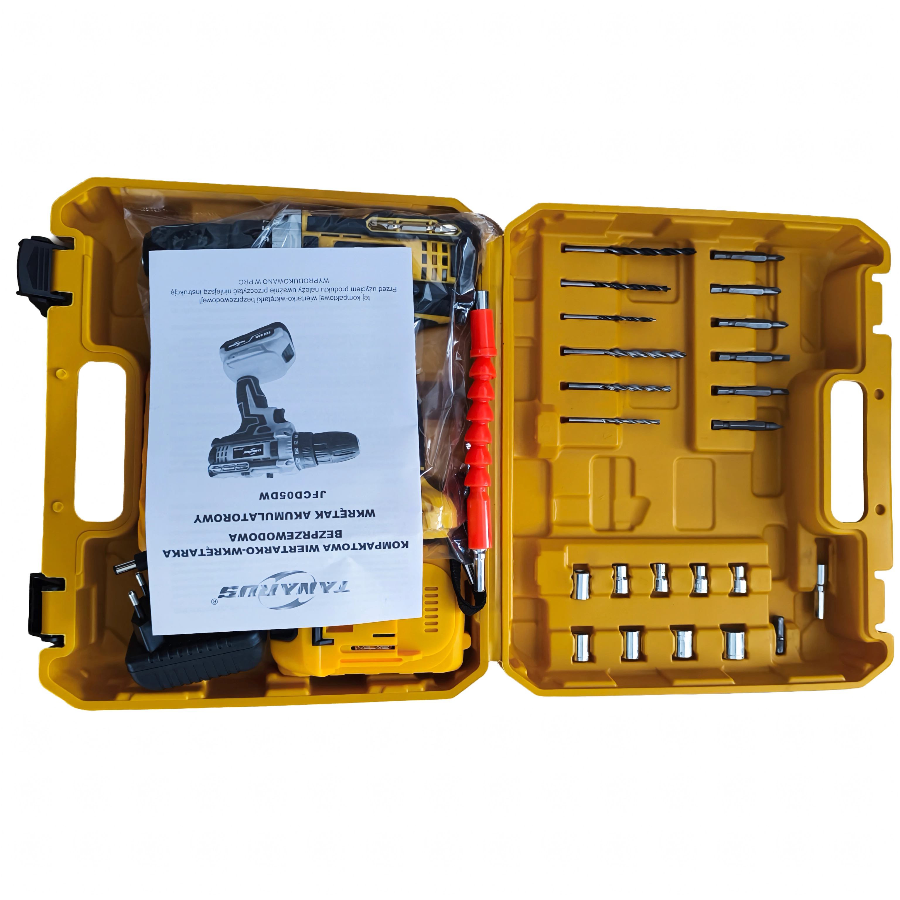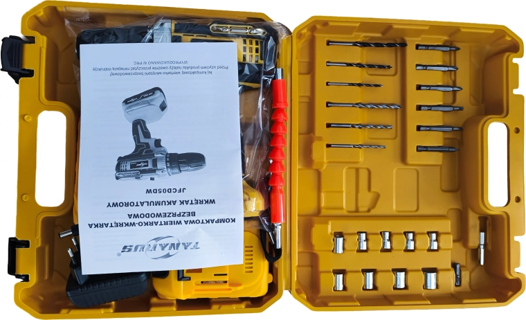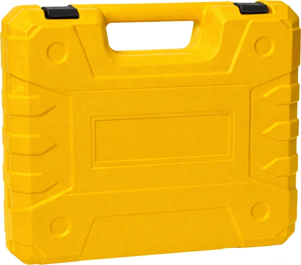 Den robuste kuffert holder alt pænt på plads. Et sæt bits, bor og en fleksibel forlængelse gør arbejdet lettere selv på svært tilgængelige steder.