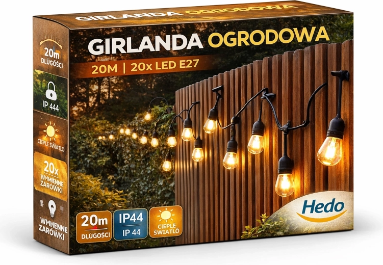 Skab en hyggelig stemning i haven, på terrassen, altanen og indendørs med en lyskæde på 20 m med 20 varme LED-pærer. IP44-beskyttelse, udskiftelige E27-pærer og en solid, fleksibel kabel sikrer lang levetid, nem installation og imponerende dekorativ belysning til aftenhygge og særlige lejligheder.
