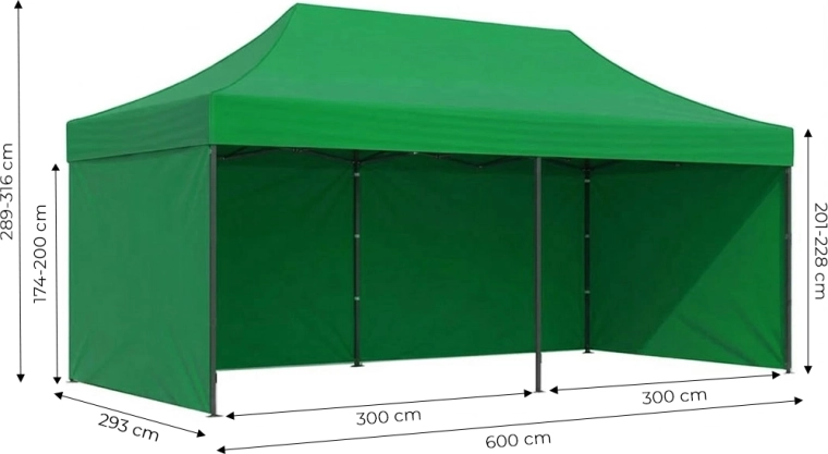 Taget i 420D med PVC-belægning og væggene i 210D med PVC-belægning giver modstandsdygtighed over for regn og UV-stråling. Med 4-trins højdejustering kan du tilpasse både frihøjde og totalhøjde præcist efter behov. Pakken indeholder alt til sikker forankring og nem transport.