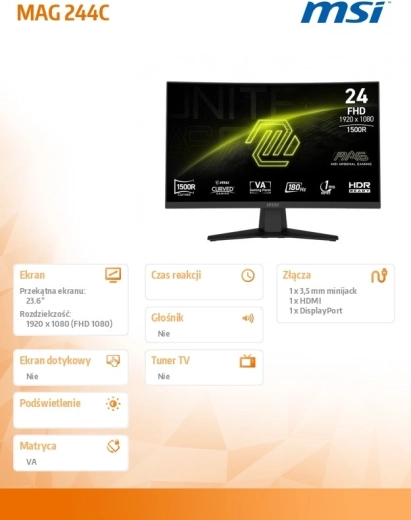 Nyd flydende gaming og arbejde på den buede skærm MAG 244C med en skærmstørrelse på 23,6", Full HD-opløsning og en opdateringshastighed på 180 Hz. Takket være LED-teknologi, moderne kurvatur for bedre indlevelse og det elegante sorte design får du skarpe billeder og behagelig visning hele dagen.