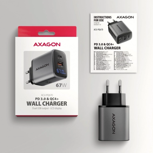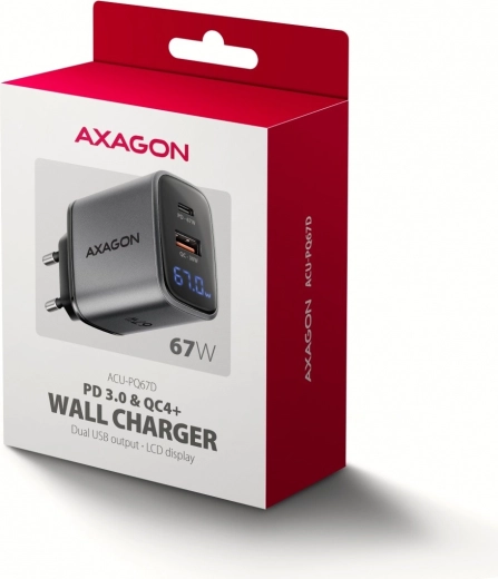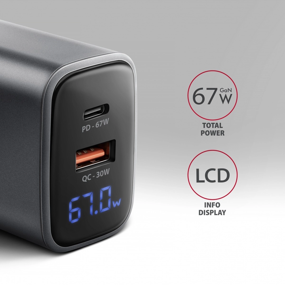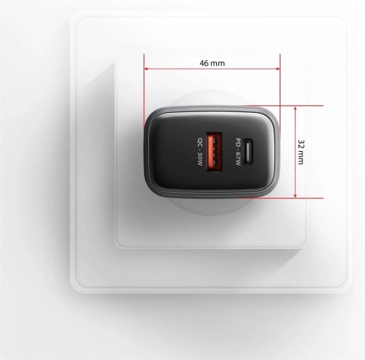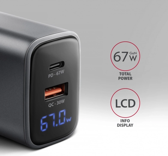 Den alsidige oplader med avanceret GaN-teknologi leverer høj effekt i et kompakt kabinet. Porten USB‑C PD 3.0 (op til 67 W) er ideel til moderne bærbare computere, tablets og telefoner, mens USB‑A QC 3.0 (op til 30 W) er perfekt til hurtig opladning af smartphones. Ved samtidig brug af begge porte fordeler opladeren intelligent effekten og opretholder stabil og sikker opladning.