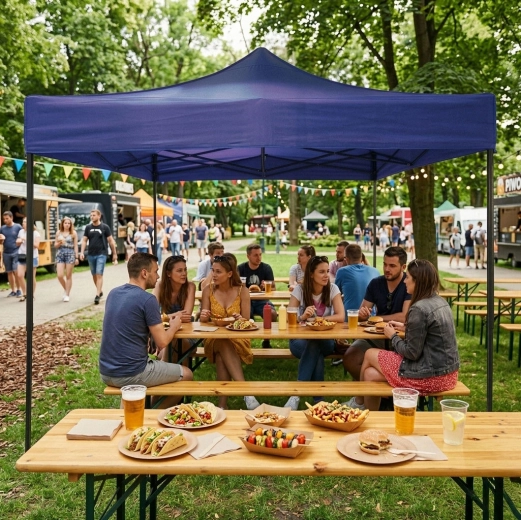 Sakseskelet af pulverlakeret stål foldes automatisk ud – uden værktøj og kompliceret montering. Klar til brug på få øjeblikke i haven og til events.
