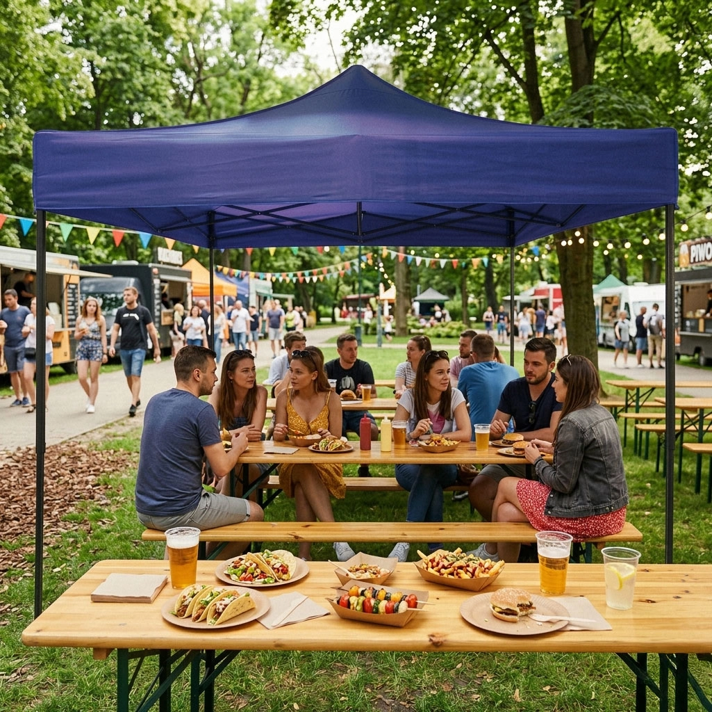 Tag i 420D og vægge i 210D med PVC-belægning afviser vand og beskytter mod UV-stråling. Ideel til sæsonbrug på markeder og havesammenkomster.