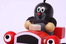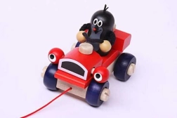 Træsamlebil med motiv af Mulvarpen, som blinker under bevægelse. Velegnet til leg og udvikling af børns motoriske færdigheder.