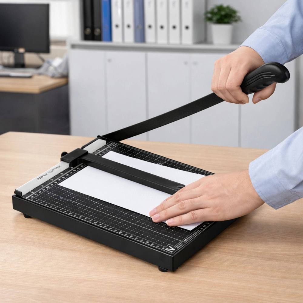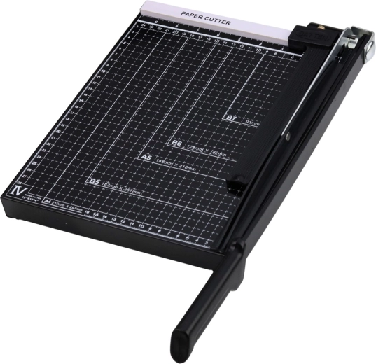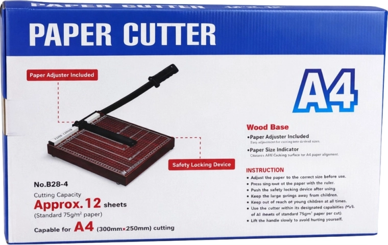 Denne A4-papirguillotine er ideel til kontor, skole, trykkeri og hjemmeværksted. Den stabile base med målestreger og formatmarkeringer hjælper med at placere dokumentet præcist før skæring. Det metalliske skærearm med lang arm gør det let at lave rene og lige snit uden stor kraftanvendelse.